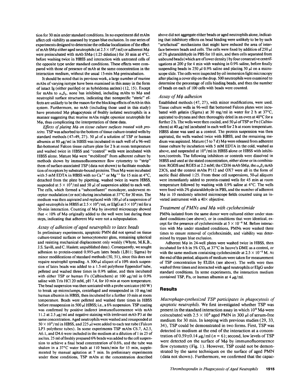 We have investigated the cell surface recognition mechanisms used by human monocyte-derived macrophages (M phi) in phagocytosis of intact aging human neutrophils (PMNs) undergoing apoptosis. This study shows that the adhesive protein thrombospondin (TSP) was present in the interaction, both associated with the M phi surface and in solution at a mean concentration of 0.59 micrograms/ml. The interaction was inhibited by treatment of M phi (but not aged PMN) with cycloheximide, but could be "rescued" by replenishment with exogenous TSP. Under control conditions, M phi recognition of aged PMNs was specifically potentiated by purified platelet TSP at 5 micrograms/ml, present either in the interaction or if preincubated with either cell type, suggesting that TSP might act as a "molecular bridge" between the two cell types. In support, both aged PMN and M phi were found to adhere to TSP, and phagocytosis of aged PMN was specifically inhibited by (a) excess soluble TSP; (b) antibodies to TSP that also inhibit TSP-mediated adhesion to aged PMN; and (c) down-regulation of M phi receptors for TSP by plating M phi on TSP-coated surfaces. Furthermore, inhibition with mAbs/Arg-Gly-Asp-Ser peptide of the candidate M phi receptors for TSP, CD36, and alpha v beta 3 exerted synergistic effects on both M phi recognition of aged PMN and M phi adhesion to TSP, indicating that "two point" adhesion of TSP to these M phi structures is involved in phagocytosis of aged PMN. Our findings indicate newly defined roles for TSP and CD36 in phagocytic clearance of senescent neutrophils, which may limit inflammatory tissue injury and promote resolution.