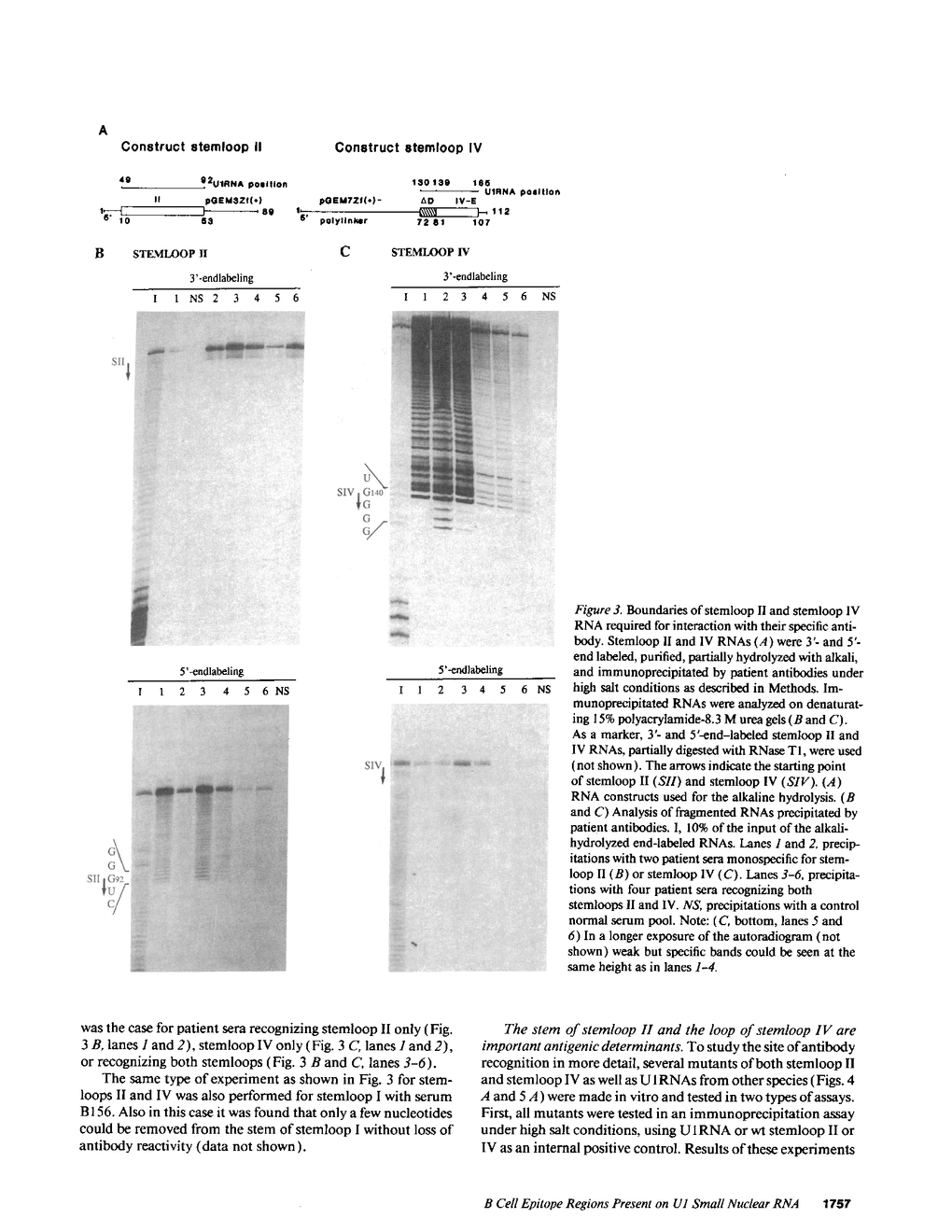 Autoantibodies specifically directed to U1RNA were found in patients suffering from systemic lupus erythematosus (SLE) overlap syndromes. To obtain more insight in the mechanism responsible for this U1RNA-specific antibody formation and to use the antibodies eventually as a tool to study U1RNA-protein (U1RNP) interactions, the B cell epitopes on U1RNA were mapped. Using in vitro synthesized domains of U1RNA, the main epitope regions were found in stemloops II and IV. Furthermore, 3'-end or 5'-end truncation of both stemloop II and stemloop IV showed that the conformation of the stemloops is critical for antibody recognition. Mutant studies on both stemloops indicated that in the case of stemloop II the stem is the main antigenic region, whereas in stemloop IV, the loop (E-loop) is a main target. The results of this study support the idea that the anti-U1RNA autoantibody could be the result of a process driven by the human U1RNP complex itself (antigen-driven process).
