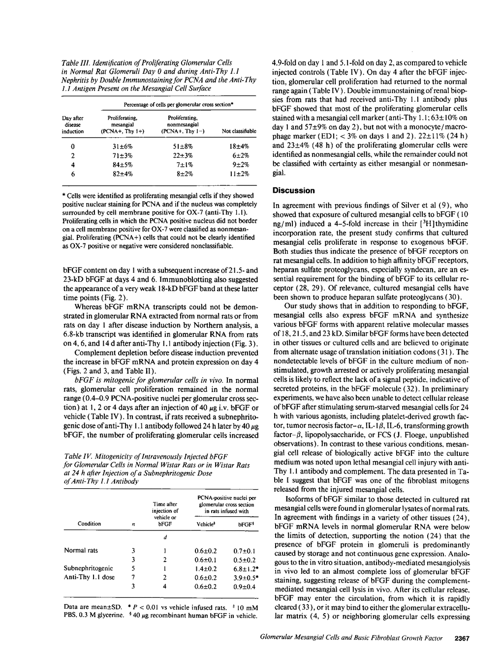 Mesangial injury and cell proliferation are frequent findings in various glomerular diseases in man. Previous studies have demonstrated that basic fibroblast growth factor (bFGF) is a potent mesangial cell mitogen in vitro. To further elucidate the role of bFGF in rat mesangial cell (RMC) proliferation, we examined whether RMC synthesize bFGF in vitro and whether bFGF is involved in mesangial proliferation in vivo. Cultured RMC expressed bFGF protein (23, 21.5, and 18 kD forms) and bFGF mRNA, and released biologically active bFGF into the culture medium after antibody- and complement-mediated injury. Normal rat glomeruli in vivo contained no detectable bFGF mRNA, but bFGF protein (23 and 21.5 kD) could be demonstrated, which immunolocalized to the mesangium. Glomerular bFGF decreased markedly during the acute phase of glomerulonephritis induced by anti-Thy 1.1 antibody, compatible with mesangial bFGF release after complement-mediated mesangiolysis. During the subsequent mesangial proliferative phase, glomerular bFGF protein and mRNA increased above normal. Intrarenal infusion of heparin did not affect the bFGF immunostaining of glomeruli at this stage, indicating a predominantly intracellular localization of the bFGF. The capability of bFGF to mediate proliferation in the anti-Thy 1.1 model was further supported by experiments in which intravenous bFGF given 24 h after a subnephritogenic dose of anti-Thy 1.1 antibody led to a 4.9- to 5.1-fold increase in glomerular cell proliferation (with > 60% of the cells identified as mesangial cells by double immunolabeling). No such increase was observed in normal rats injected with bFGF. These data show that mesangial cells produce and release bFGF after injury and that bFGF is mitogenic for injured mesangial cells in vivo. Release of mesangial cell bFGF thus may be an important mechanism involved in the initiation of mesangial cell proliferation in vivo.