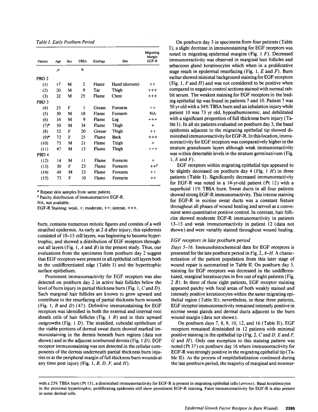 Epidermal growth factor (EGF) along with several related peptide growth factors has been shown both in vivo and in vitro to accelerate events associated with epidermal wound repair. EGF and transforming growth factor alpha act by binding to a common EGF receptor tyrosine kinase thereby initiating a series of events which ultimately regulate cell proliferation. This study examined the immunohistochemical localization of EGF receptor (EGF-R) in burn wound margins, adjacent proliferating epithelium, and closely associated sweat ducts, sebaceous glands, and hair follicles. Tissue specimens removed during surgical debridement were obtained from full and partial thickness burn wounds in 32 patients with total body surface area burns ranging from 2 to 88%. In the early postburn period (days 2-4), prominent staining for EGF-R was found in undifferentiated, marginal keratinocytes, adjacent proliferating, hypertrophic epithelium, and both marginal and nonmarginal hair follicles, sweat ducts, and sebaceous glands. During the late postburn period (days 5-16), EGF-R was depleted along leading epithelial margins; however, immunoreactive EGF-R remained intensely positive in the hypertrophic epithelium and all skin appendages. Increased detection of immunoreactive EGF-R and the presence of [125I]EGF binding in the hypertrophic epithelium correlated positively with proliferating cell nuclear antigen distributions. Thus, the presence of EGF-R in the appropriate keratinocyte populations suggests a functional role for this receptor during wound repair. Dynamic modulation in EGF receptor distribution during the temporal sequence of repair provides further evidence that an EGF/transforming growth factor alpha/EGF-R-mediated pathway is activated during human wound repair.