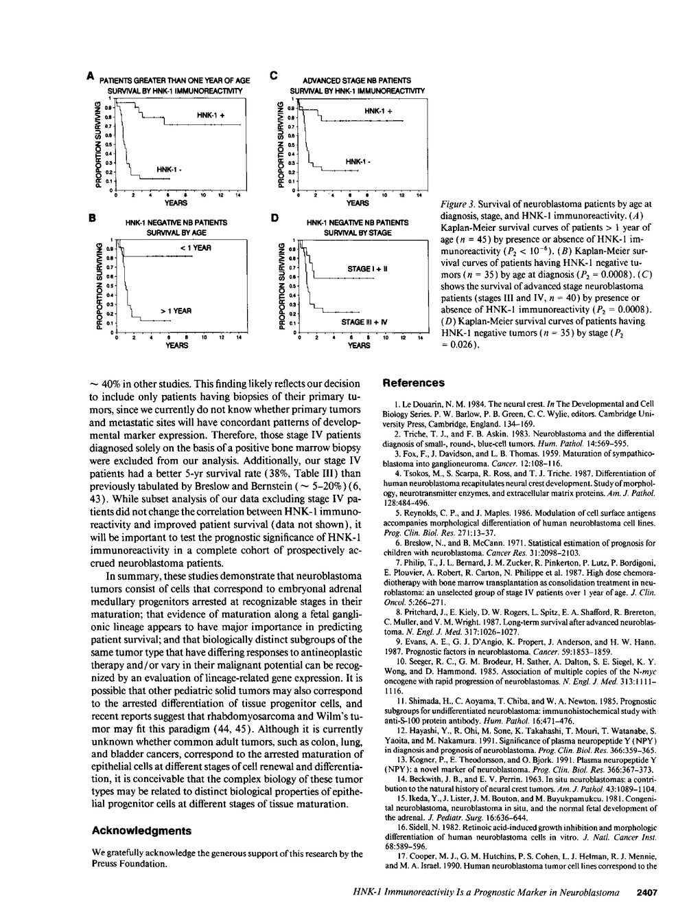 We have recently presented a model of human adrenal medullary histogenesis that incorporates all neural crest-derived lineages (chromaffin, sustentacular, and ganglionic) known to compose this tissue. To determine if neuroblastomas correspond to the arrested maturation of embryonal adrenal medullary cells, we evaluated the expression of adrenal medullary developmental markers in 81 neuroblastoma tumors. We found that patterns of chromaffin-related gene expression in these tumors correlated exactly with the patterns observed during maturation of adrenal medullary cells (P2 < 10(-5). In a multivariate Cox proportional hazards analysis of developmental marker expression and other well-recognized prognostic variables, evidence of maturation along a fetal ganglionic lineage, as monitored by HNK-1 immunoreactivity (relative risk of 6.42, P2 = 0.0001), and age at diagnosis (relative risk of 5.05, P2 = 0.0042) were independent and significant prognostic indicators of patient survival. These studies demonstrate that neuroblastomas correspond to embryonal adrenal medullary cells arrested at recognizable stages during development, and that evidence of maturation along a fetal ganglionic lineage appears to have major importance in predicting patient survival.