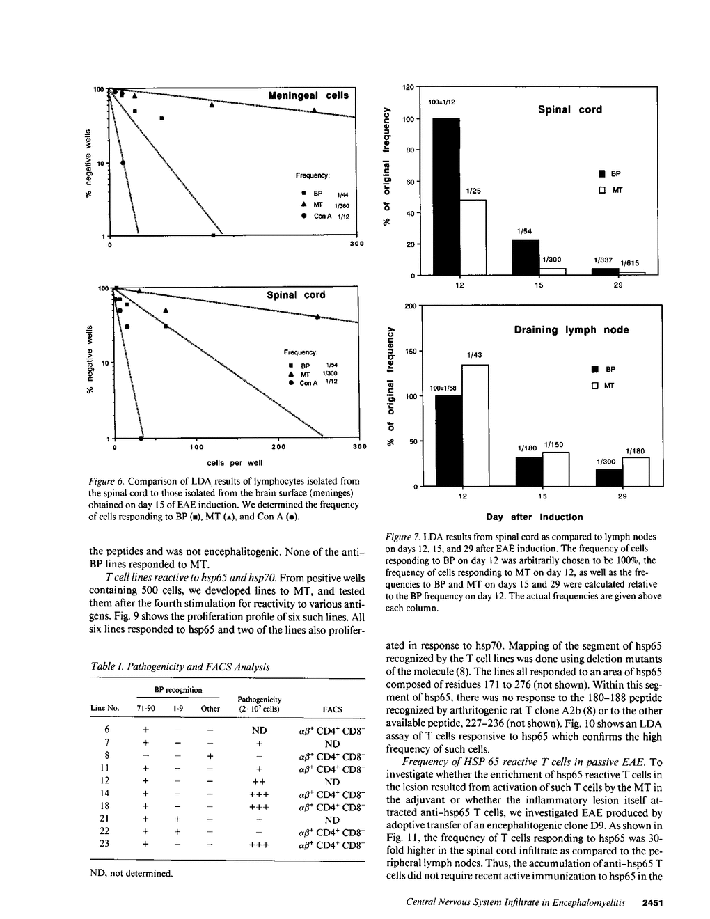 To characterize the cellular immune response in an autoimmune lesion, we investigated the accumulation of specific T cells in the central nervous system in actively induced experimental autoimmune encephalomyelitis (EAE) in Lewis rats, using a limiting dilution analysis (LDA) assay for T cells that proliferate in response to antigens. Lymphocytes isolated from the spinal cord infiltrate were compared with cells from the popliteal lymph nodes with respect to frequency of cells responding to basic protein (BP), mycobacterium tuberculosis (MT), the 65-kD heat shock protein (hsp65), allogeneic brown norway spleen cells, and concanavalin A. Additionally, we compared the BP frequency in acute EAE of cells from the spinal cord, peripheral blood, spleen and lymph nodes, and the spinal cord and lymph node after recovery from EAE. We found that acute EAE was associated with marked enrichment of BP-reactive T cells in the spinal cord relative to their frequency in the lymphoid organs and peripheral blood. The infiltrate was also enriched for T cells responding to hsp65; alloreactive T cells, in contrast, were not enriched. The frequency of BP reactive T cells in the spinal cord was highest at the peak of paralysis; however, BP-reactive T cells could still be detected at moderate frequencies after clinical recovery. We established BP- and Mycobacteria-reactive T cell lines from the spinal infiltrates that were CD4+ and TcR alpha beta +. Most of the BP lines were found to react to the major encephalitogenic epitope of guinea pig BP for rats (amino acids 71-90); these lines were found to mediate EAE in naive recipients. T cell lines recognizing other epitopes of BP were not encephalitogenic. All of the lines responsive to Mycobacteria recognized hsp65 or hsp70. These results indicating that the immune infiltrate in active EAE is enriched with cells responding to the autoantigen and to hsp65 were confirmed in EAE adoptively transferred by anti-BP T cell clone.