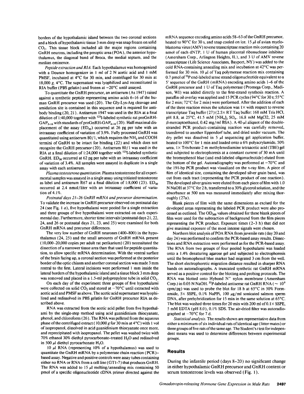Changes in gonadotropins and gonadal steroids during sexual maturation in rats and humans are well documented but little is known about hypothalamic gonadotropin-releasing hormone (GnRH) gene expression in relation to these events. This study measured hypothalamic proGnRH mRNA, GnRH precursor, and fully processed GnRH from postnatal day 8 until day 62 in male rats. GnRH precursor increased on day 22, reached a peak on day 24, declined on day 25 and returned to infantile levels by day 28. A secondary rise in precursor occurred at about day 40 when testosterone levels increased. GnRH mRNA increased on day 22 and remained elevated over the study period to day 26. GnRH increased on day 24 and remained at this level until a secondary rise occurred coincident with the testosterone rise at about day 40. The ratio of GnRH precursor to GnRH was high until day 24 and was low from day 26 onwards, reflecting a maturation of the processing enzyme system between these 2 d. Thus, an abrupt increase in GnRH gene transcription (mRNA) occurs early in juvenile male rats (day 22), well before the onset of puberty. An increase in GnRH precursor accompanies these early changes and this is followed by the maturation of processing as evidenced by the rapid decline of precursor and increase in GnRH from day 24 onward.