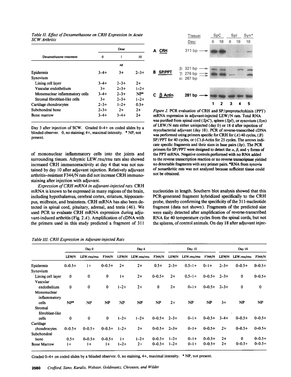 Corticotropin-releasing hormone (CRH), the principal regulator of the hypothalamic-pituitary-adrenal axis, is also secreted in peripheral inflammatory sites, where it acts as a local proinflammatory agent. Arthritis-susceptible LEW/N rats have profoundly deficient hypothalamic CRH responses to inflammatory stimuli and other stressors. Arthritis-resistant F344/N rats, on the other hand, have a robust increase in hypothalamic CRH in response to the same stimuli. Contrasting with these hypothalamic CRH responses, we now show that CRH expression is markedly increased in the joints and surrounding tissues of LEW/N rats with streptococcal cell wall- and adjuvant-induced arthritis, whereas it is not increased in similarly treated F344/N rats and is only transiently increased in congenitally athymic nude LEW.rnu/rnu rats. Glucocorticoid treatment suppressed, but did not eliminate, CRH immunoreactivity in the joints of LEW/N rats. CRH mRNA was present in inflamed synovia, as well as in spinal cord, and inflamed synovia also expressed specific CRH-binding sites. We compared CRH expression in inflamed joints with another well-characterized proinflammatory neuropeptide, substance P (SP), and found that SP immunoreactivity paralleled that of CRH. In summary, although LEW/N rats have deficient hypothalamic CRH responses to inflammatory stimuli compared with F344/N rats, they express relatively high levels of CRH at the site of inflammation. Analogous to SP, CRH may be delivered to the inflammatory site by peripheral nerves and/or synthesized at the inflammatory site. These data provide further support for the concept that CRH not only triggers the pituitary-adrenal antiinflammatory cascade, but also functions as an antithetically active local mediator of acute and chronic inflammatory arthritis. These data also illustrate the complex interrelationships of the nervous, endocrine, immune, and inflammatory systems.
