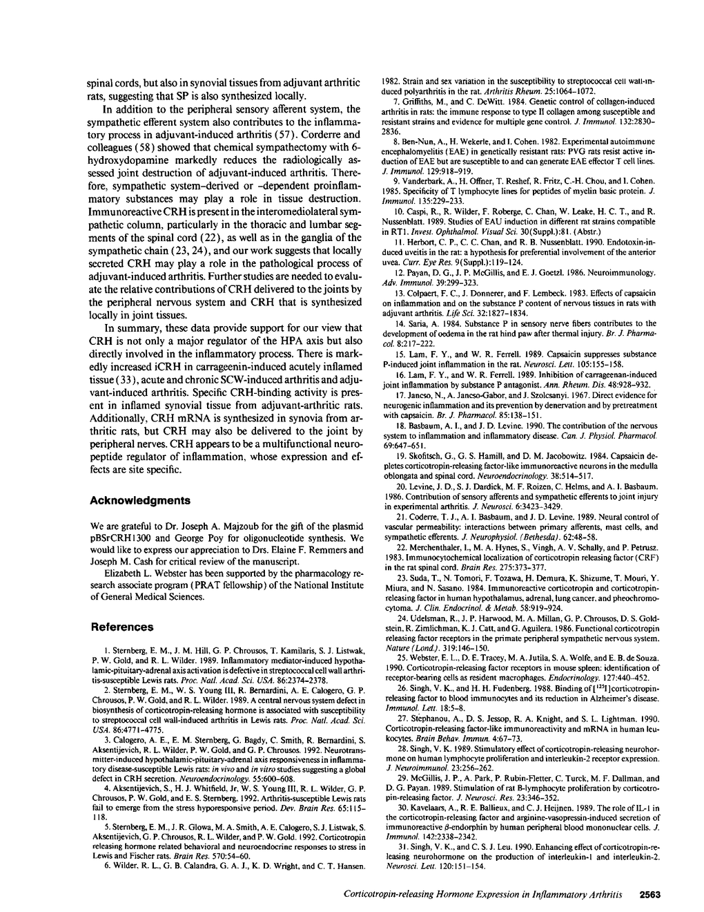 Corticotropin-releasing hormone (CRH), the principal regulator of the hypothalamic-pituitary-adrenal axis, is also secreted in peripheral inflammatory sites, where it acts as a local proinflammatory agent. Arthritis-susceptible LEW/N rats have profoundly deficient hypothalamic CRH responses to inflammatory stimuli and other stressors. Arthritis-resistant F344/N rats, on the other hand, have a robust increase in hypothalamic CRH in response to the same stimuli. Contrasting with these hypothalamic CRH responses, we now show that CRH expression is markedly increased in the joints and surrounding tissues of LEW/N rats with streptococcal cell wall- and adjuvant-induced arthritis, whereas it is not increased in similarly treated F344/N rats and is only transiently increased in congenitally athymic nude LEW.rnu/rnu rats. Glucocorticoid treatment suppressed, but did not eliminate, CRH immunoreactivity in the joints of LEW/N rats. CRH mRNA was present in inflamed synovia, as well as in spinal cord, and inflamed synovia also expressed specific CRH-binding sites. We compared CRH expression in inflamed joints with another well-characterized proinflammatory neuropeptide, substance P (SP), and found that SP immunoreactivity paralleled that of CRH. In summary, although LEW/N rats have deficient hypothalamic CRH responses to inflammatory stimuli compared with F344/N rats, they express relatively high levels of CRH at the site of inflammation. Analogous to SP, CRH may be delivered to the inflammatory site by peripheral nerves and/or synthesized at the inflammatory site. These data provide further support for the concept that CRH not only triggers the pituitary-adrenal antiinflammatory cascade, but also functions as an antithetically active local mediator of acute and chronic inflammatory arthritis. These data also illustrate the complex interrelationships of the nervous, endocrine, immune, and inflammatory systems.