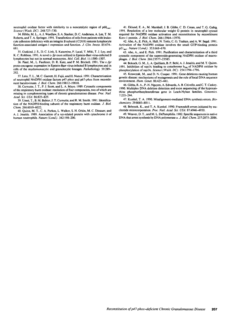 Epstein-Barr virus-transformed lymphocytes generate superoxide in response to various agonists in an enzymatic reaction similar to that which occurs in stimulated phagocytes. We generated transformed B lymphoblast cell lines from controls, from four patients with p47-phox-deficient chronic granulomatous disease, and from three parents. The cells from controls and from the parents generated 7.0-35 nmol of O2-/10(7) cells per 30 min in response to phorbol myristate acetate. None of the patient cell lines generated any detectable superoxide. Both p47-phox and p67-phox were detected by immunoblot in the cytosol of control and parent cell lines and, as in neutrophils, these proteins had affinity for GTP-agarose. The patients' cell lines contained no detectable p47-phox by immunoblot. mRNA for both cytosolic proteins was detected in all cell lines. We generated cDNA and obtained multiple clones from two patients by polymerase chain reaction. One patient was a compound heterozygote with each allele resulting in an early stop codon. Clones derived from the other patient demonstrated only a GT deletion at base 75. The cDNA for p47-phox was inserted into an EBV-expression vector and stably transfected cell lines were obtained using hygromycin B selection. Transfected cell lines from a p47-phox-deficient patient generated normal levels of superoxide and had readily detectable cytosolic p47-phox. Thus, B lymphoblasts provide an excellent model system for studies of the NADPH oxidase, for expression of functional recombinant forms of oxidase components, and for initial experimental approaches to genetic reconstitution in CGD.