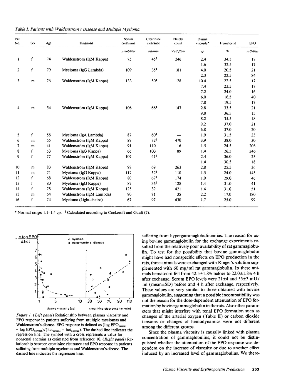 The aim of this study was to examine whether altered plasma viscosity could contribute to the inappropriately low production rate of erythropoietin (EPO) observed in patients suffering from hypergammaglobulinemias associated with multiple myeloma or Waldenström's disease. We found that the EPO formation in response to anemia in these patients was inversely related to plasma viscosity. A similar inverse relationship between plasma viscosity and EPO production was seen in rats in which EPO formation had been stimulated by exchange transfusion and the plasma viscosity of which was thereby altered by using exchange solutions of different composition to alter plasma viscosity and thus whole blood viscosity independently from hematocrit. Raising the gammaglobulin concentration to approximately 40 mg/ml plasma in the rats almost totally blunted the rise in serum EPO levels despite a fall of the hematocrit to 20%. Determination of renal EPO mRNA levels by RNase protection revealed that the reductions in serum EPO levels at higher plasma viscosities were paralleled by reductions in renal EPO mRNA levels. Taken together, our findings suggest that plasma viscosity may be a significant inhibitory modulator of anemia-induced EPO formation. The increased plasma viscosity in patients with hypergammaglobulinemias may therefore contribute to the inappropriate EPO production, which is a major reason for the anemia developing in these patients.