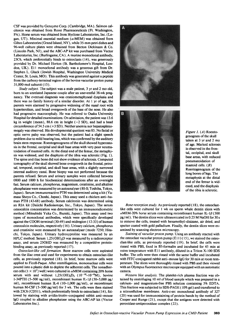Craniometaphyseal dysplasia (CMD) is a rare craniotubular bone dysplasia transmitted in autosomal dominant or recessive form. This disease is characterized by cranial bone hyperostosis and deformity of the metaphyses of the long bones. Using osteoclast-like cells formed from patient bone marrow cells, we investigated the pathophysiology of CMD in a 3-yr-old patient. Untreated bone marrow cells from the patient differentiated into osteoclast-like cells in vitro. These cells were shown to have vitronectin beta-receptors using a specific monoclonal antibody, i.e., 23C6 (CD51), which reacts with osteoclasts in human bone biopsy samples. However, the number of these osteoclast-like cells formed from the patient's bone marrow was only 40% of the normal controls. 1,25-dihydroxyvitamin-D3, bovine 1-34 parathyroid hormone, recombinant human interleukin-1 beta, recombinant human interleukin-6, or recombinant human macrophage colony-stimulating factor significantly increased, while salmon calcitonin significantly inhibited, the number of osteoclast-like cells. However, these cells could not resorb sperm whale dentin slices and lacked the osteoclast-reactive vacuolar proton pump as evidenced by a monoclonal antibody (E11). Western blot analysis using a monoclonal antibody to pp60c-src (327) revealed that protooncogene c-src expression by the platelets of the CMD patient was comparable to the normal control. These data suggest that: (a) the hyperostosis and the metaphyseal long bone deformity in the present CMD patient might be explained by osteoclast dysfunction due to impaired expression of the osteoclast-reactive vacuolar proton pump; and (b) a protooncogene c-src was not associated with the pathogenesis of the present CMD patient.