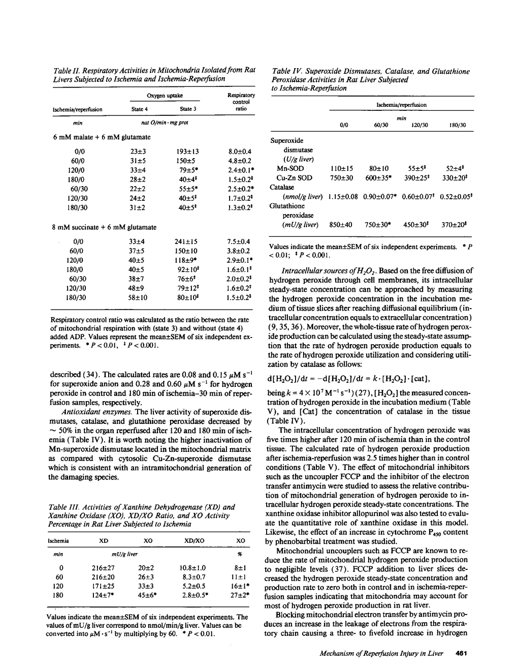 The time course of oxidative stress and tissue damage in zonal liver ischemia-reperfusion in rat liver in vivo was evaluated. After 180 min of ischemia, surface chemiluminescence decreased to zero, state 3 mitochondrial respiration decreased by 70-80%, and xanthine oxidase activity increased by 26% without change in the water content and in the activities of superoxide dismutase, catalase, and glutathione peroxidase. After reperfusion, marked increases in oxyradical production and tissue damage were detected. Mitochondrial oxygen uptake in state 3 and respiratory control as well as the activities of superoxide dismutase, catalase, and glutathione peroxidase and the level of nonenzymatic antioxidants (evaluated by the hydroperoxide-initiated chemiluminescence) were decreased. The severity of the post-reperfusion changes correlated with the time of ischemia. Morphologically, hepatocytes appeared swollen with zonal cord disarrangement which ranged from mild to severe for the tissue reperfused after 60-180 min of ischemia. Neutrophil infiltration was observed after 180 min of ischemia and 30 min of reperfusion. Mitochondria appear as the major source of hydrogen peroxide in control and in reperfused liver, as indicated by the almost complete inhibition of hydrogen peroxide production exerted by the uncoupler carbonylcyanide p-(trifluoromethoxy) phenylhydrazone. Additionally, inhibition of mitochondrial electron transfer by antimycin in liver slices reproduced the inhibition of state 3 mitochondrial respiration and the increase in hydrogen peroxide steady-state concentration found in reperfused liver. Increased rates of oxyradical production by inhibited mitochondria appear as the initial cause of oxidative stress and liver damage during early reperfusion in rat liver.