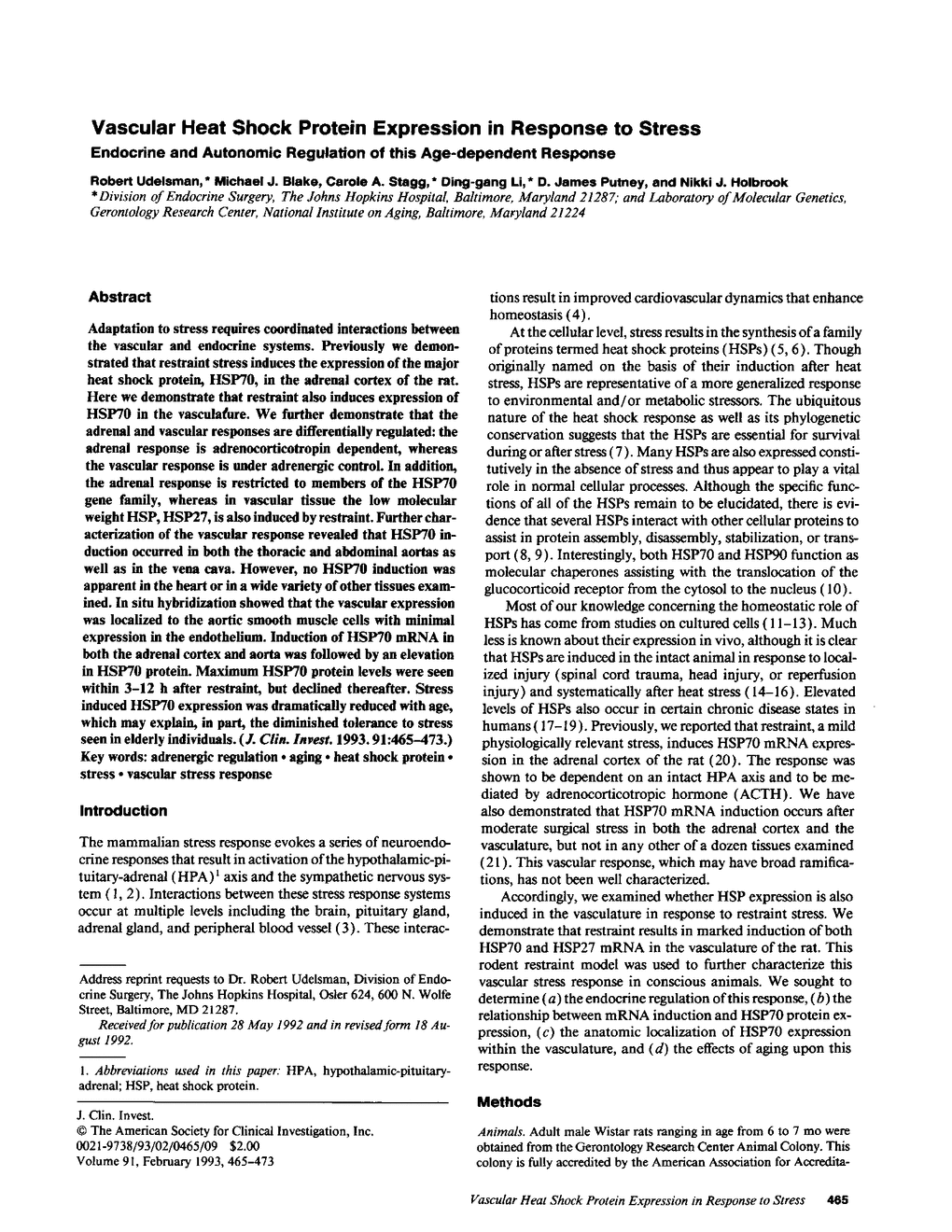 Adaptation to stress requires coordinated interactions between the vascular and endocrine systems. Previously we demonstrated that restraint stress induces the expression of the major heat shock protein, HSP70, in the adrenal cortex of the rat. Here we demonstrate that restraint also induces expression of HSP70 in the vasculature. We further demonstrate that the adrenal and vascular responses are differentially regulated: the adrenal response is adrenocorticotropin dependent, whereas the vascular response is under adrenergic control. In addition, the adrenal response is restricted to members of the HSP70 gene family, whereas in vascular tissue the low molecular weight HSP, HSP27, is also induced by restraint. Further characterization of the vascular response revealed that HSP70 induction occurred in both the thoracic and abdominal aortas as well as in the vena cava. However, no HSP70 induction was apparent in the heart or in a wide variety of other tissues examined. In situ hybridization showed that the vascular expression was localized to the aortic smooth muscle cells with minimal expression in the endothelium. Induction of HSP70 mRNA in both the adrenal cortex and aorta was followed by an elevation in HSP70 protein. Maximum HSP70 protein levels were seen within 3-12 h after restraint, but declined thereafter. Stress induced HSP70 expression was dramatically reduced with age, which may explain, in part, the diminished tolerance to stress seen in elderly individuals.