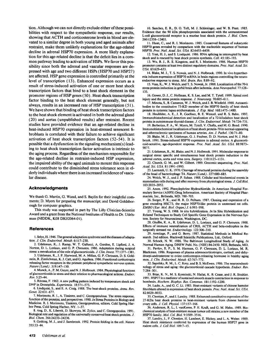 Adaptation to stress requires coordinated interactions between the vascular and endocrine systems. Previously we demonstrated that restraint stress induces the expression of the major heat shock protein, HSP70, in the adrenal cortex of the rat. Here we demonstrate that restraint also induces expression of HSP70 in the vasculature. We further demonstrate that the adrenal and vascular responses are differentially regulated: the adrenal response is adrenocorticotropin dependent, whereas the vascular response is under adrenergic control. In addition, the adrenal response is restricted to members of the HSP70 gene family, whereas in vascular tissue the low molecular weight HSP, HSP27, is also induced by restraint. Further characterization of the vascular response revealed that HSP70 induction occurred in both the thoracic and abdominal aortas as well as in the vena cava. However, no HSP70 induction was apparent in the heart or in a wide variety of other tissues examined. In situ hybridization showed that the vascular expression was localized to the aortic smooth muscle cells with minimal expression in the endothelium. Induction of HSP70 mRNA in both the adrenal cortex and aorta was followed by an elevation in HSP70 protein. Maximum HSP70 protein levels were seen within 3-12 h after restraint, but declined thereafter. Stress induced HSP70 expression was dramatically reduced with age, which may explain, in part, the diminished tolerance to stress seen in elderly individuals.