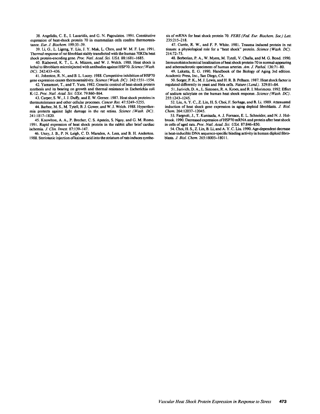 Adaptation to stress requires coordinated interactions between the vascular and endocrine systems. Previously we demonstrated that restraint stress induces the expression of the major heat shock protein, HSP70, in the adrenal cortex of the rat. Here we demonstrate that restraint also induces expression of HSP70 in the vasculature. We further demonstrate that the adrenal and vascular responses are differentially regulated: the adrenal response is adrenocorticotropin dependent, whereas the vascular response is under adrenergic control. In addition, the adrenal response is restricted to members of the HSP70 gene family, whereas in vascular tissue the low molecular weight HSP, HSP27, is also induced by restraint. Further characterization of the vascular response revealed that HSP70 induction occurred in both the thoracic and abdominal aortas as well as in the vena cava. However, no HSP70 induction was apparent in the heart or in a wide variety of other tissues examined. In situ hybridization showed that the vascular expression was localized to the aortic smooth muscle cells with minimal expression in the endothelium. Induction of HSP70 mRNA in both the adrenal cortex and aorta was followed by an elevation in HSP70 protein. Maximum HSP70 protein levels were seen within 3-12 h after restraint, but declined thereafter. Stress induced HSP70 expression was dramatically reduced with age, which may explain, in part, the diminished tolerance to stress seen in elderly individuals.