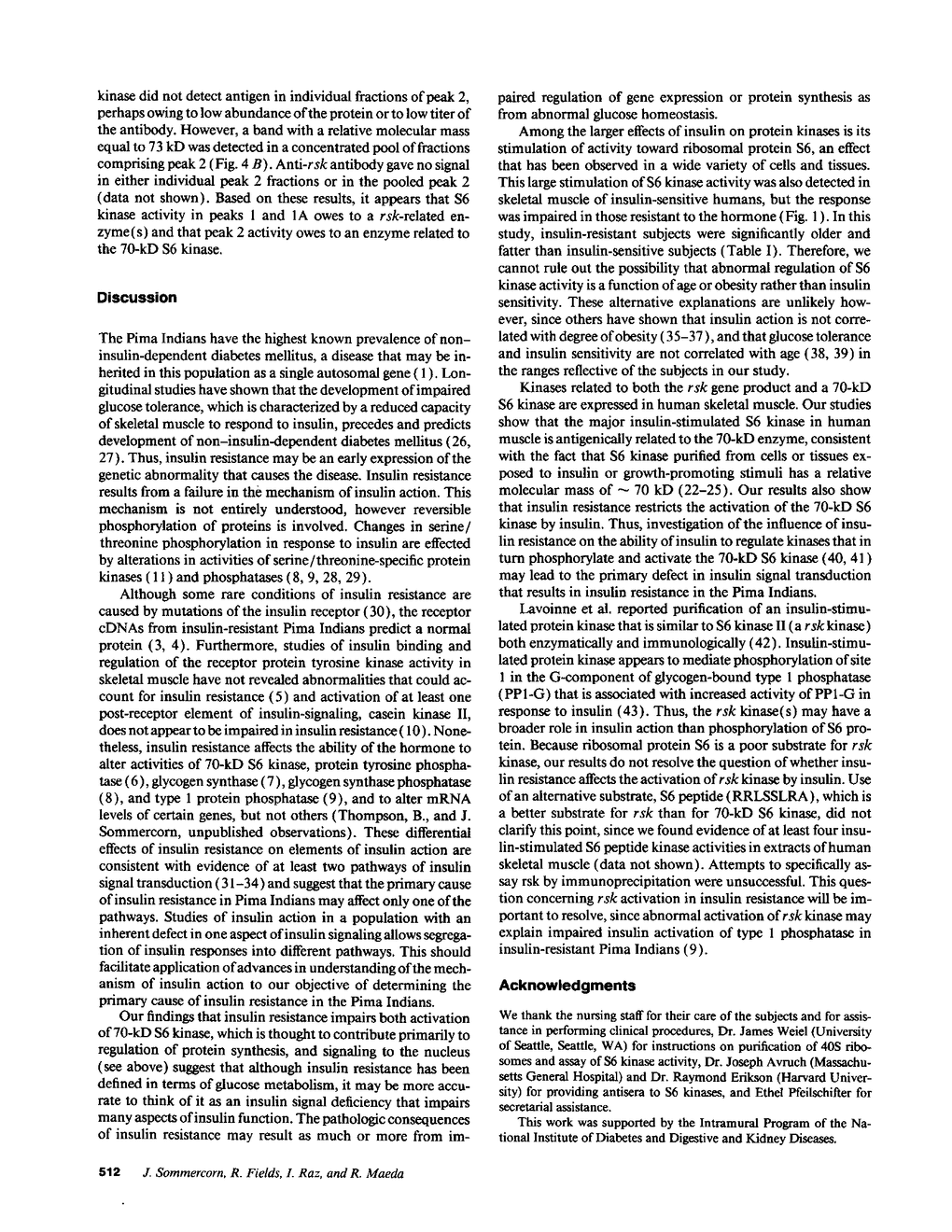 Insulin resistance in Pima Indians appears to result from a post-receptor impairment of insulin signal transduction that affects only some responses to insulin. To identify the primary lesion responsible for insulin resistance, we investigated the influence of insulin on ribosomal protein S6 kinase activities in skeletal muscle of insulin-sensitive and insulin-resistant nondiabetic Pima Indians during a 2-h hyperinsulinemic, euglycemic clamp. In sensitive subjects, S6 kinase activity was transiently activated fivefold over basal activity by 45 min of insulin infusion. Although basal activities in the two groups were similar, the response to insulin was delayed and restricted to about threefold over basal in subjects resistant to insulin. Two major S6 kinase activities in extracts of human muscle were resolved by chromatography on Mono Q. Peak 1, which accounted for basal activity owes to an enzyme antigenically related to the 90-kD S6 kinase II, a member of the rsk gene family. The major insulin-stimulated S6 kinase eluted as peak 2 and is antigenically related to a 70-kD S6 kinase. Our results show that insulin resistance impairs signaling to the 70-kD S6 kinase.