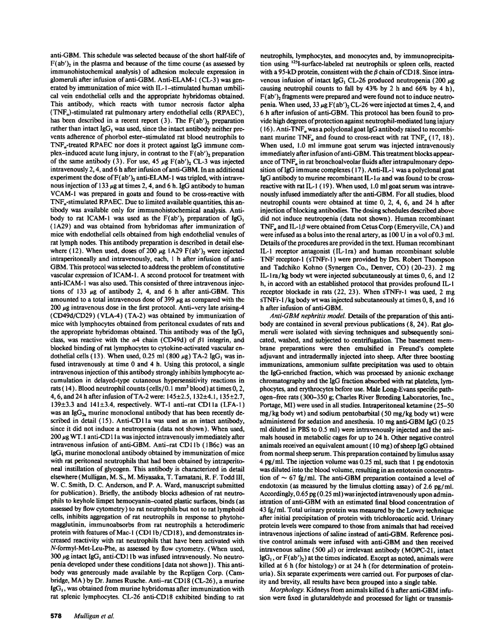 Requirements for leukocyte adhesion molecules as well as cytokines have been determined in the rat model of acute nephrotoxic nephritis. Proteinuria (at 24 h) and neutrophil accumulation in renal glomeruli (at 6 h) have been used as the endpoints. For full accumulation in glomeruli of neutrophils as well as full development of proteinuria, requirements have been demonstrated for TNF alpha, (but not IL-1), CD11b (but not CD11a), very late arising-4 (CD49d/CD29), and intercellular adhesion molecule-1 but not endothelial leukocyte adhesion molecule-1 (E-selectin). By immunohistochemical approaches, infusion of antibody to glomerular basement membrane induced glomerular upregulation of intercellular adhesion molecule-1, endothelial leukocyte adhesion molecule-1, and vascular adhesion molecule-1. Treatment of rats with anti-TNF alpha or soluble recombinant human TNF receptor-1 blocked this expression. Renal arterial infusion of TNF alpha induced glomerular expression of all three endothelial adhesion molecules, but infusion of IL-1 beta did not. These data suggest that, in neutrophil and complement-dependent anti-glomerular basement membrane-induced acute nephritis in rats, there are selective requirements for cytokines, beta 1 and beta 2 integrins, and endothelial adhesion molecules. These requirements contrast with those found in other vascular beds in which complement and neutrophil-induced vascular injury has been induced by deposition of immune complexes.