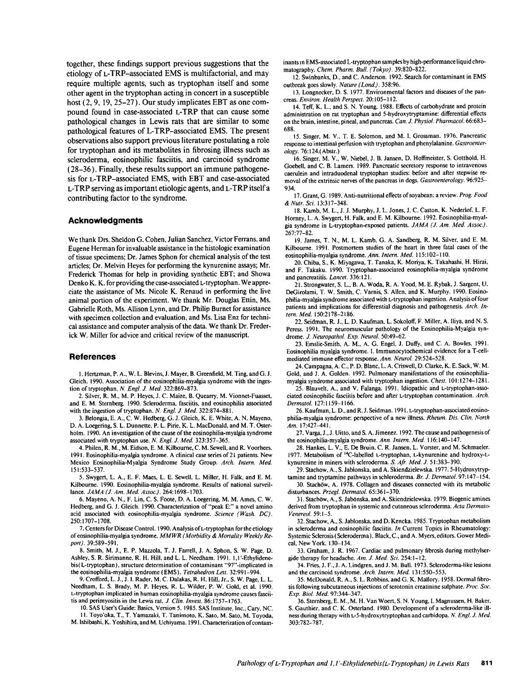 The eosinophilia-myalgia syndrome (EMS) has been associated with ingestion of L-tryptophan (L-TRP) produced by a single manufacturer. Epidemiological data implicated 1,1'-ethylidenebis (L-tryptophan) (EBT) (peak 97 or peak E) as a possible etiologic agent. We showed previously that Lewis rats treated with the L-TRP implicated in EMS develop fasciitis and perimyositis similar to those seen in human EMS. We now report the pathology associated with the treatment of Lewis rats with synthetic EBT and/or L-TRP. All animals treated for 6 wk with case-associated L-TRP or EBT developed significant myofascial thickening, compared with animals in the vehicle control and control L-TRP groups. However, even those animals receiving the control L-TRP showed a mild but significant increase in the thickness of the myofascia, compared with vehicle-treated control animals. All animals except vehicle controls also exhibited significant pancreatic pathology, including fibrosis and acinar changes. Only animals treated with case-associated L-TRP for 6 wk showed evidence of immune activation with increased frequency of CD8, Ia, and IL-2 receptor-positive cells in the peripheral blood. Animals receiving L-TRP or EBT for < 6 wk did not show significant differences in myofascial thickness, although these animals did show pancreatic acinar changes. Although these results demonstrate for the first time the pathological effects of EBT, they do not rule out the possibility that other impurities in the EMS-case-associated L-TRP may also contribute to some of the features of EMS.