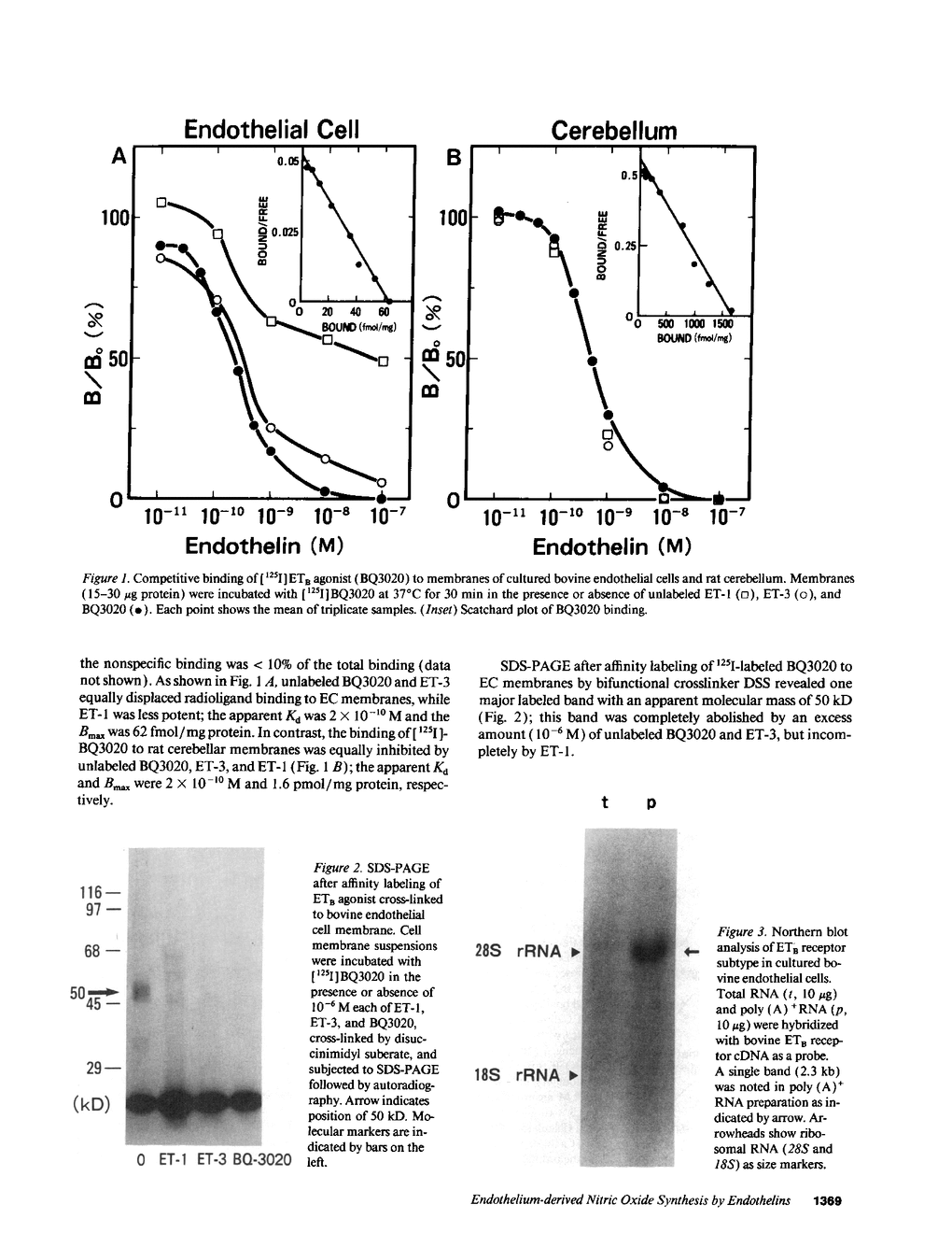 Endothelins (ET) produce endothelium-dependent vasodilation through nitric oxide (NO) synthesis. The present study was designed to elucidate the cellular mechanism by which ET induces synthesis and release of endothelium-derived NO by cultured bovine endothelial cells (EC). Binding studies revealed that bovine EC membrane had the binding sites of a novel agonist (BQ3020) for non-isopeptide-selective receptor subtype (ETB). Affinity labeling studies showed a major labeled band with the apparent molecular mass of 50 kD. Northern blot analysis demonstrated the expression of mRNA for ETB receptor. BQ3020 rapidly and dose dependently induced formation of inositol-1,4,5-triphosphate and increased intracellular Ca2+ concentrations in fura-2-loaded cells. Concomitantly, BQ3020 dose dependently stimulated production of both nitrate/nitrite (NOx) and cyclic GMP; a highly significant correlation existed between NOx and cGMP production. The stimulatory effect on NOx and cGMP production by ETB agonist was inhibited by NO synthase inhibitor monomethyl-L-arginine; this effect was reversed by coaddition of L-arginine, but not D-arginine. NOx and cGMP production stimulated by BQ3020 was inhibited by pretreatment with pertussis toxin. ETB agonist-induced NOx production was blocked by a calmodulin inhibitor and an intracellular Ca2+ chelator, but not by an extracellular Ca2+ chelator or a Ca2+ channel blocker. These data suggest that endothelins stimulate ETB receptor-mediated phosphoinositide breakdown via pertussis toxin-sensitive G-protein(s), which triggers release of intracellular Ca2+, thereby activating Ca2+/calmodulin-dependent NO synthase in EC.