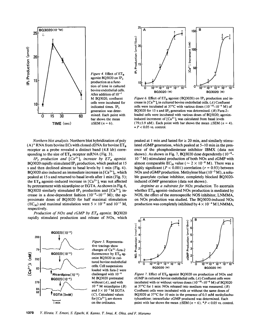 Endothelins (ET) produce endothelium-dependent vasodilation through nitric oxide (NO) synthesis. The present study was designed to elucidate the cellular mechanism by which ET induces synthesis and release of endothelium-derived NO by cultured bovine endothelial cells (EC). Binding studies revealed that bovine EC membrane had the binding sites of a novel agonist (BQ3020) for non-isopeptide-selective receptor subtype (ETB). Affinity labeling studies showed a major labeled band with the apparent molecular mass of 50 kD. Northern blot analysis demonstrated the expression of mRNA for ETB receptor. BQ3020 rapidly and dose dependently induced formation of inositol-1,4,5-triphosphate and increased intracellular Ca2+ concentrations in fura-2-loaded cells. Concomitantly, BQ3020 dose dependently stimulated production of both nitrate/nitrite (NOx) and cyclic GMP; a highly significant correlation existed between NOx and cGMP production. The stimulatory effect on NOx and cGMP production by ETB agonist was inhibited by NO synthase inhibitor monomethyl-L-arginine; this effect was reversed by coaddition of L-arginine, but not D-arginine. NOx and cGMP production stimulated by BQ3020 was inhibited by pretreatment with pertussis toxin. ETB agonist-induced NOx production was blocked by a calmodulin inhibitor and an intracellular Ca2+ chelator, but not by an extracellular Ca2+ chelator or a Ca2+ channel blocker. These data suggest that endothelins stimulate ETB receptor-mediated phosphoinositide breakdown via pertussis toxin-sensitive G-protein(s), which triggers release of intracellular Ca2+, thereby activating Ca2+/calmodulin-dependent NO synthase in EC.
