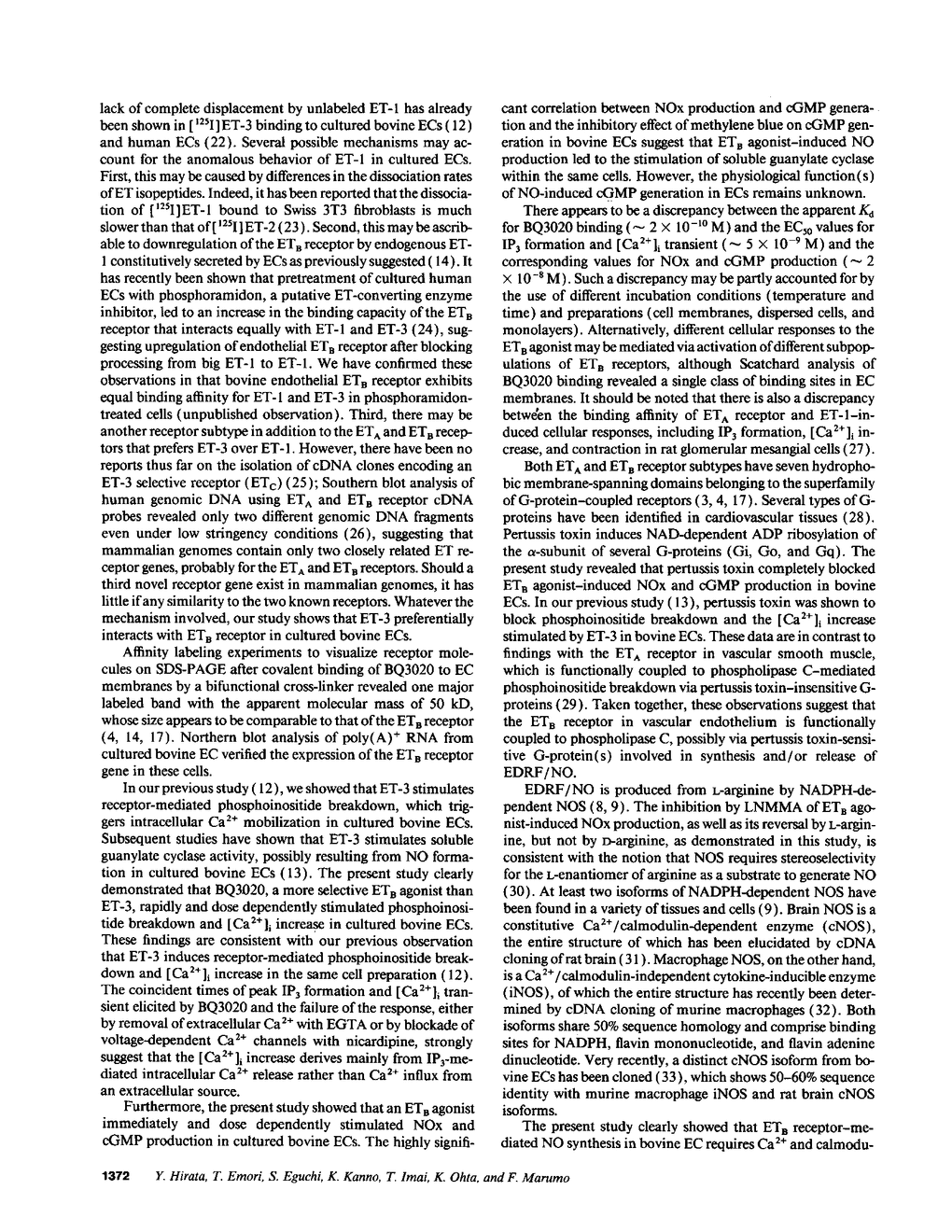 Endothelins (ET) produce endothelium-dependent vasodilation through nitric oxide (NO) synthesis. The present study was designed to elucidate the cellular mechanism by which ET induces synthesis and release of endothelium-derived NO by cultured bovine endothelial cells (EC). Binding studies revealed that bovine EC membrane had the binding sites of a novel agonist (BQ3020) for non-isopeptide-selective receptor subtype (ETB). Affinity labeling studies showed a major labeled band with the apparent molecular mass of 50 kD. Northern blot analysis demonstrated the expression of mRNA for ETB receptor. BQ3020 rapidly and dose dependently induced formation of inositol-1,4,5-triphosphate and increased intracellular Ca2+ concentrations in fura-2-loaded cells. Concomitantly, BQ3020 dose dependently stimulated production of both nitrate/nitrite (NOx) and cyclic GMP; a highly significant correlation existed between NOx and cGMP production. The stimulatory effect on NOx and cGMP production by ETB agonist was inhibited by NO synthase inhibitor monomethyl-L-arginine; this effect was reversed by coaddition of L-arginine, but not D-arginine. NOx and cGMP production stimulated by BQ3020 was inhibited by pretreatment with pertussis toxin. ETB agonist-induced NOx production was blocked by a calmodulin inhibitor and an intracellular Ca2+ chelator, but not by an extracellular Ca2+ chelator or a Ca2+ channel blocker. These data suggest that endothelins stimulate ETB receptor-mediated phosphoinositide breakdown via pertussis toxin-sensitive G-protein(s), which triggers release of intracellular Ca2+, thereby activating Ca2+/calmodulin-dependent NO synthase in EC.