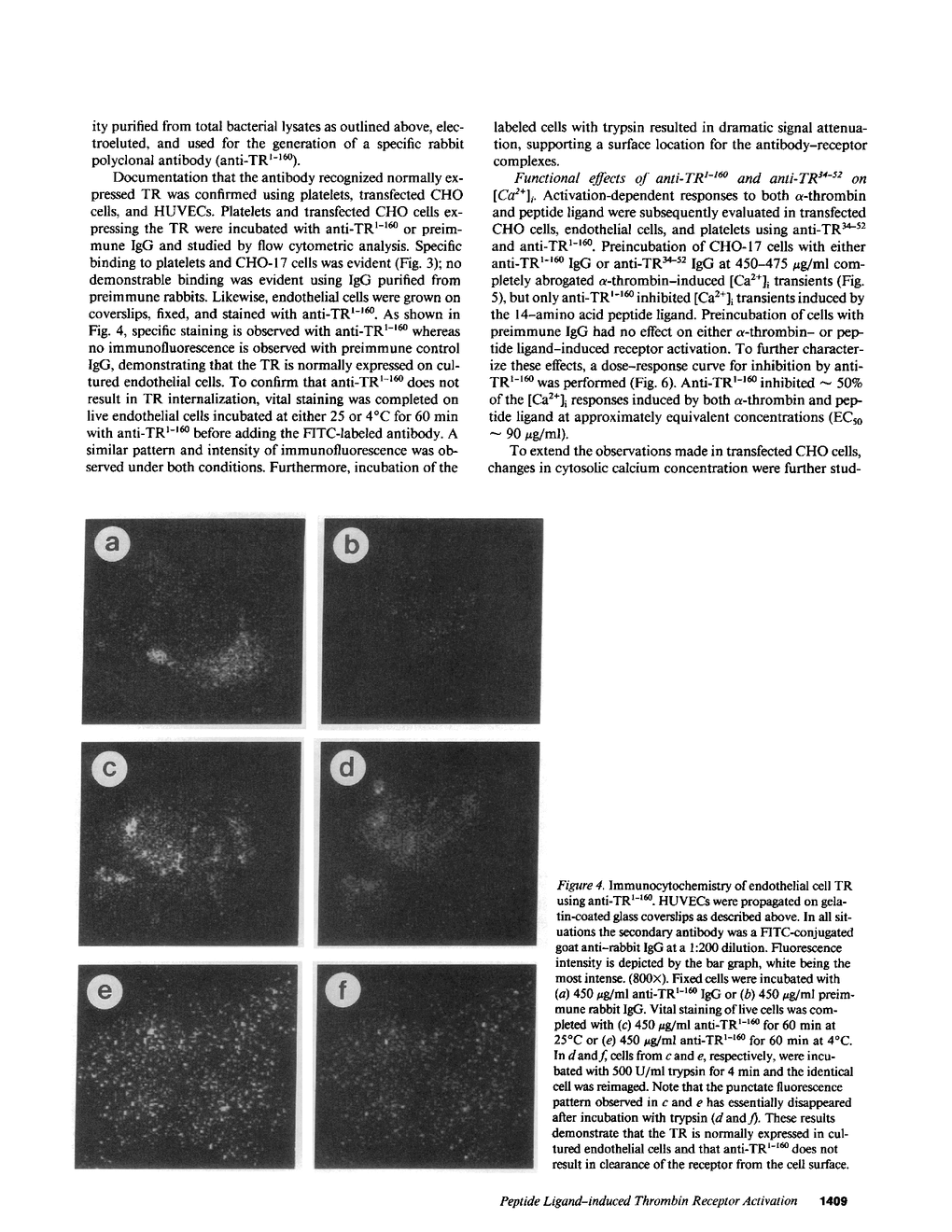 A thrombin receptor (TR) demonstrating a unique activation mechanism has recently been isolated from a megakaryocytic (Dami) cell line. To further study determinants of peptide ligand-mediated activation phenomenon, we have isolated, cloned, and stably expressed the identical receptor from a human umbilical vein endothelial cell (HUVEC) library. Chinese hamster ovary (CHO) cells expressing a functional TR (CHO-TR), platelets, and HUVECs were then used to specifically characterize alpha-thrombin- and peptide ligand-induced activation responses using two different antibodies: anti-TR34-52 directed against a 20-amino acid peptide spanning the thrombin cleavage site, and anti-TR1-160 generated against the NH2-terminal 160 amino acids of the TR expressed as a chimeric protein in Escherichia coli. Activation-dependent responses to both alpha-thrombin (10 nM) and peptide ligand (20 microM) were studied using fura 2-loaded cells and microspectrofluorimetry. Whereas preincubation of CHO-TR with anti-TR34-52 abolished only alpha-thrombin-induced [Ca2+]i transients, preincubation with anti-TR1-160 abrogated both alpha-thrombin- and peptide ligand-induced responses. This latter inhibitory effect was dose dependent and similar for both agonists, with an EC50 of approximately 90 micrograms/ml. Anti-TR1-160 similarly abolished peptide ligand-induced [Ca2+]i transients in platelets and HUVECs, whereas qualitatively different responses characterized by delayed but sustained elevations in [Ca2+]i transients were evident using alpha-thrombin. Platelet aggregation to low concentrations of both ligands was nearly abolished by anti-TR1-160, although some shape change remained; anti-TR34-52 only inhibited alpha-thrombin-induced aggregation. These data establish that a critical recognition sequence for peptide ligand-mediated receptor activation is contained on the NH2-terminal portion of the receptor, upstream from the first transmembrane domain. Furthermore, alpha-thrombin-induced activation of HUVECs and platelets may be partially mediated by an alternative mechanism(s) or receptor(s).