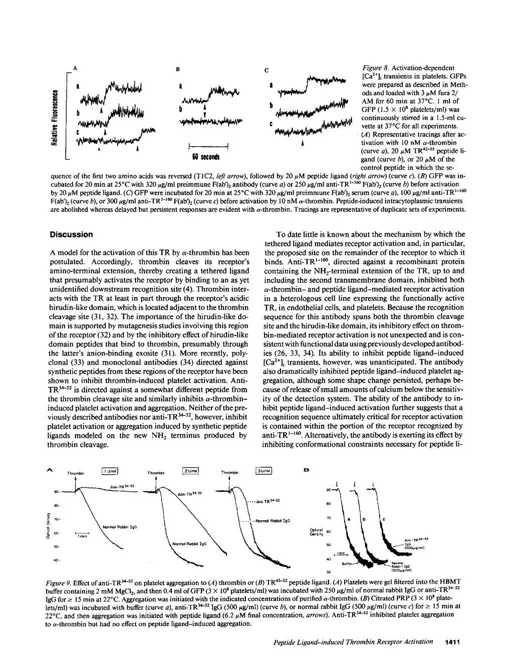 A thrombin receptor (TR) demonstrating a unique activation mechanism has recently been isolated from a megakaryocytic (Dami) cell line. To further study determinants of peptide ligand-mediated activation phenomenon, we have isolated, cloned, and stably expressed the identical receptor from a human umbilical vein endothelial cell (HUVEC) library. Chinese hamster ovary (CHO) cells expressing a functional TR (CHO-TR), platelets, and HUVECs were then used to specifically characterize alpha-thrombin- and peptide ligand-induced activation responses using two different antibodies: anti-TR34-52 directed against a 20-amino acid peptide spanning the thrombin cleavage site, and anti-TR1-160 generated against the NH2-terminal 160 amino acids of the TR expressed as a chimeric protein in Escherichia coli. Activation-dependent responses to both alpha-thrombin (10 nM) and peptide ligand (20 microM) were studied using fura 2-loaded cells and microspectrofluorimetry. Whereas preincubation of CHO-TR with anti-TR34-52 abolished only alpha-thrombin-induced [Ca2+]i transients, preincubation with anti-TR1-160 abrogated both alpha-thrombin- and peptide ligand-induced responses. This latter inhibitory effect was dose dependent and similar for both agonists, with an EC50 of approximately 90 micrograms/ml. Anti-TR1-160 similarly abolished peptide ligand-induced [Ca2+]i transients in platelets and HUVECs, whereas qualitatively different responses characterized by delayed but sustained elevations in [Ca2+]i transients were evident using alpha-thrombin. Platelet aggregation to low concentrations of both ligands was nearly abolished by anti-TR1-160, although some shape change remained; anti-TR34-52 only inhibited alpha-thrombin-induced aggregation. These data establish that a critical recognition sequence for peptide ligand-mediated receptor activation is contained on the NH2-terminal portion of the receptor, upstream from the first transmembrane domain. Furthermore, alpha-thrombin-induced activation of HUVECs and platelets may be partially mediated by an alternative mechanism(s) or receptor(s).