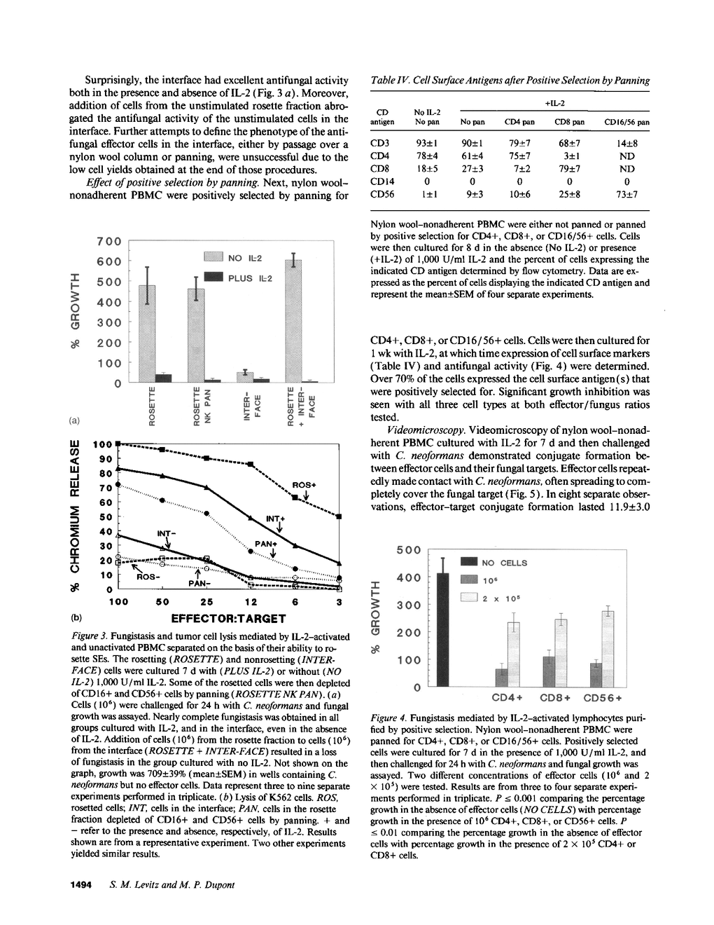 Recently we demonstrated that the nonadherent (to plastic) fraction of human PBMC could be activated by IL-2 to inhibit Cryptococcus neoformans growth. Here we characterize the antifungal effector cells. Depletion by panning of natural killer (NK) (CD16+, CD56+) cells from nylon wool-treated, IL-2-activated PBMC markedly decreased lytic activity against a tumor cell target (K562) but did not affect antifungal activity. Panning out T (CD3+, CD5+) cells enhanced activity against tumor cells but partially abrogated activity against C. neoformans. IL-2-activated T cells of 95% purity, obtained by panning out NK cells from PBMC forming rosettes with sheep erythrocytes, had excellent antifungal activity but suboptimal antitumor activity. The nonrosetted cells (which were virtually free of T cells and enriched for NK cells) had both antitumor and antifungal activity, even if cultured without IL-2. CD4+, CD8+, and CD56+ cells, purified by positive selection by panning, directly inhibited cryptococcal growth. Conjugate formation between fungi and both CD56+ and CD5+ effector cells was demonstrated by videomicroscopy and immunoperoxidase staining. Thus, IL-2-activated T cells and NK cells form conjugates with and directly inhibit the growth of C. neoformans. To our knowledge, these data are the first demonstration of human T cells directly inhibiting growth of a microbial target.