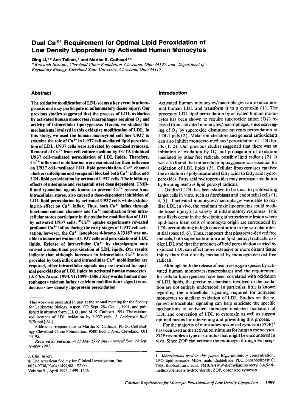 The oxidative modification of LDL seems a key event in atherogenesis and may participate in inflammatory tissue injury. Our previous studies suggested that the process of LDL oxidation by activated human monocytes/macrophages required O2- and activity of intracellular lipoxygenase. Herein, we studied the mechanisms involved in this oxidative modification of LDL. In this study, we used the human monocytoid cell line U937 to examine the role of Ca2+ in U937 cell-mediated lipid peroxidation of LDL. U937 cells were activated by opsonized zymosan. Removal of Ca2+ from cell culture medium by EGTA inhibited U937 cell-mediated peroxidation of LDL lipids. Therefore, Ca2+ influx and mobilization were examined for their influence on U937 cell-mediated LDL lipid peroxidation. Ca2+ channel blockers nifedipine and verapamil blocked both Ca2+ influx and LDL lipid peroxidation by activated U937 cells. The inhibitory effects of nifedipine and verapamil were dose dependent. TMB-8 and ryanodine, agents known to prevent Ca2+ release from intracellular stores, also caused a dose-dependent inhibition of LDL lipid peroxidation by activated U937 cells while exhibiting no effect on Ca2+ influx. Thus, both Ca2+ influx through functional calcium channels and Ca2+ mobilization from intracellular stores participate in the oxidative modification of LDL by activated U937 cells. 45Ca2+ uptake experiments revealed profound Ca2+ influx during the early stages of U937 cell activation, however, the Ca2+ ionophore 4-bromo A23187 was unable to induce activation of U937 cells and peroxidation of LDL lipids. Release of intracellular Ca2+ by thapsigargin only caused a suboptimal peroxidation of LDL lipids. Our results indicate that although increases in intracellular Ca2+ levels provided by both influx and intracellular Ca2+ mobilization are required, other intracellular signals may be involved for optimal peroxidation of LDL lipids by activated human monocytes.