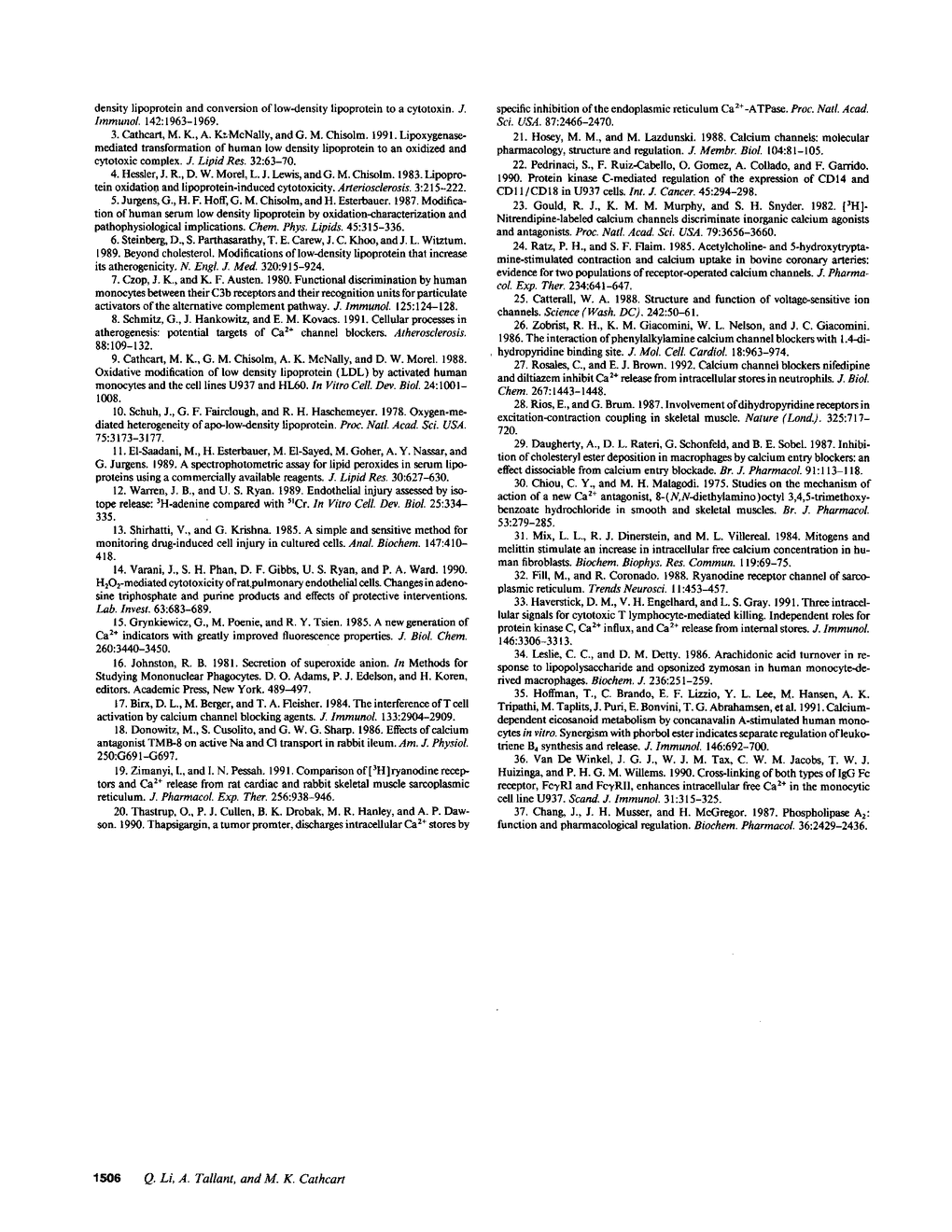 The oxidative modification of LDL seems a key event in atherogenesis and may participate in inflammatory tissue injury. Our previous studies suggested that the process of LDL oxidation by activated human monocytes/macrophages required O2- and activity of intracellular lipoxygenase. Herein, we studied the mechanisms involved in this oxidative modification of LDL. In this study, we used the human monocytoid cell line U937 to examine the role of Ca2+ in U937 cell-mediated lipid peroxidation of LDL. U937 cells were activated by opsonized zymosan. Removal of Ca2+ from cell culture medium by EGTA inhibited U937 cell-mediated peroxidation of LDL lipids. Therefore, Ca2+ influx and mobilization were examined for their influence on U937 cell-mediated LDL lipid peroxidation. Ca2+ channel blockers nifedipine and verapamil blocked both Ca2+ influx and LDL lipid peroxidation by activated U937 cells. The inhibitory effects of nifedipine and verapamil were dose dependent. TMB-8 and ryanodine, agents known to prevent Ca2+ release from intracellular stores, also caused a dose-dependent inhibition of LDL lipid peroxidation by activated U937 cells while exhibiting no effect on Ca2+ influx. Thus, both Ca2+ influx through functional calcium channels and Ca2+ mobilization from intracellular stores participate in the oxidative modification of LDL by activated U937 cells. 45Ca2+ uptake experiments revealed profound Ca2+ influx during the early stages of U937 cell activation, however, the Ca2+ ionophore 4-bromo A23187 was unable to induce activation of U937 cells and peroxidation of LDL lipids. Release of intracellular Ca2+ by thapsigargin only caused a suboptimal peroxidation of LDL lipids. Our results indicate that although increases in intracellular Ca2+ levels provided by both influx and intracellular Ca2+ mobilization are required, other intracellular signals may be involved for optimal peroxidation of LDL lipids by activated human monocytes.