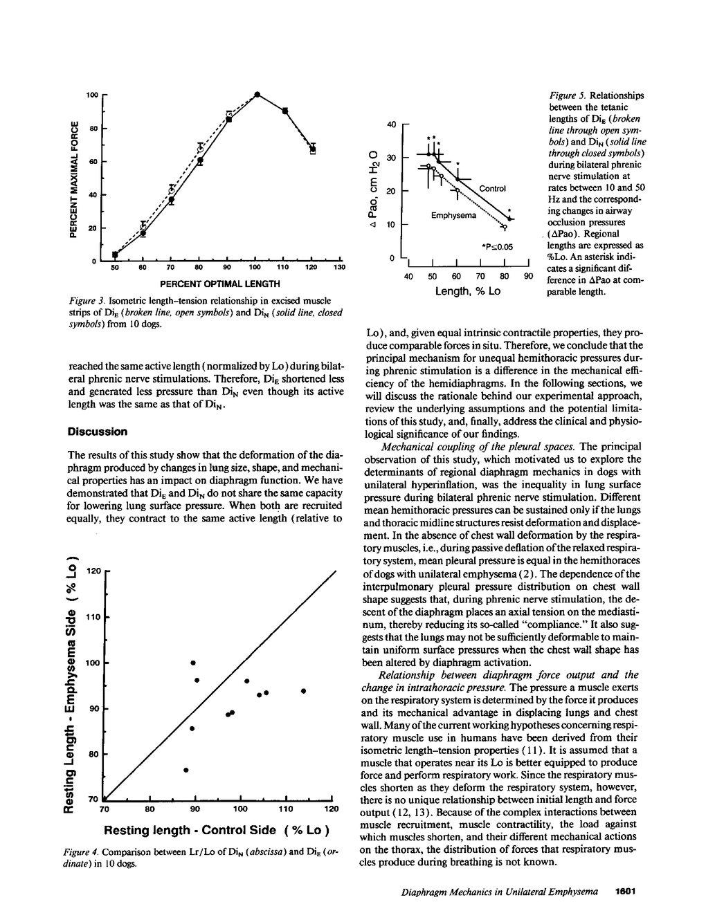 We studied dogs with unilateral papain-induced emphysema to answer two questions: (1) Do emphysema lung-apposed hemidiaphragm (DiE) and normal lung-apposed hemidiaphragm (DiN) have equal capacities for lowering lung surface pressure? and (2) Are side-to-side differences in intrathoracic pressure the result of unequal force outputs by DiE and DiN or are they caused by differences in their mechanical efficiency as pressure generators? After the airways of the emphysematous and normal lungs were intubated with a dual lumen endotracheal tube, both phrenic nerves were maximally stimulated at rates between 1 and 50 Hz and the changes in airway occlusion pressure (delta PaoE,N) and diaphragm length (sonomicrometry) were recorded. In all animals, delta PaoN exceeded delta PaoE. Differences in pressure ranged from 1.2 +/- 0.6 cm H2O during a twitch to 6.0 +/- 2.9 cm H2O during a 50-Hz tetanus. Midcostal bundles of DiE shortened less than corresponding bundles of DiN, but both reached the same active length relative to their optimal lengths, which were measured in vitro. There was no significant difference in fiber type distribution, fiber cross-sectional area, or maximal isometric tetanic tensions among midcostal regions of DiE and DiN. We conclude that unilateral hyperinflation impairs the mechanical efficiency of the apposing hemidiaphragm as a pressure generator.