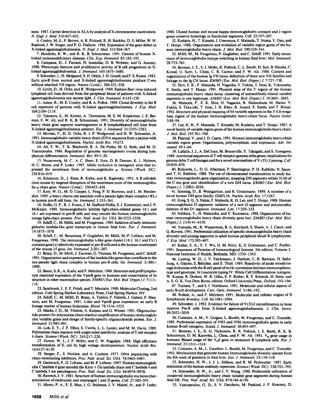 Expression of Ig and Ig-related genes has been studied in bone marrow cells from two patients with severe form of X-linked agammaglobulinemia (XLA). Phenotypic analysis revealed the presence of pre-B cells, in the absence of mature B cell markers. The pre-B-specific genes, lambda-like and V pre-B, were normally transcribed. Sequence analysis of 48 distinct V-D-J cDNA clones directly derived from XLA bone marrow cells indicated that they had characteristics of an early fetal pre-B repertoire. All VH families were identified, with a strong bias in the gene usage: a few VH genes were largely overexpressed, either germline or slightly mutated; most genes had been located 3' of the VH locus and were also used in fetal liver (8-13 wk of gestation). Short D regions, (resulting from D-D fusion, making usage of all D genes in both orientations with utilization of the three reading frames), restricted N diversity, and a fetal JH usage pattern were also observed. Taken together, our data suggest that the XLA defect does not alter V-D-J rearrangements nor the expression of mu, lambda-like, and V pre-B transcripts and most likely results in a poor efficiency of some critical steps of the B cell maturation.