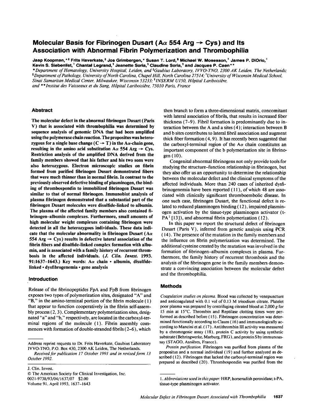 J Koopman, F Haverkate, J Grimbergen, S T Lord, M W Mosesson, J P DiOrio, K S Siebenlist, C Legrand, J Soria, C Soria