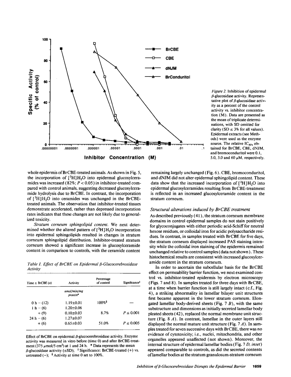 The interstices of the mammalian stratum corneum contain lipids in a system of continuous membrane bilayers critical for the epidermal permeability barrier. During the transition from inner to outer stratum corneum, the content of polar lipids including glucosylceramides, decreases while ceramide content increases. We investigated whether inhibition of glucosylceramide hydrolysis would alter epidermal permeability barrier function. Daily topical applications of bromoconduritol B epoxide (BrCBE) to intact murine skin selectively inhibited beta-glucocerebrosidase, increased glucosylceramide content of stratum corneum with ceramide content remaining largely unchanged, and caused a progressive, reversible decrease in barrier function. Histochemistry of inhibitor-treated epidermis revealed persistence of periodic acid-Schiff-positive staining in stratum corneum cell membranes, consistent with retention of hexose moieties. Electron microscopy of inhibitor-treated samples revealed no evidence of toxicity or changes in the epidermal lipid delivery system. However, immature membrane structures persisted in the intercellular spaces throughout the stratum corneum, with reappearance of mature membrane structures progressing outward from the lower stratum corneum upon termination of BrCBE. Finally, the induced barrier abnormality was not reversed by coapplications of ceramide. These data demonstrate that glucosylceramide hydrolysis is important in the formation of the epidermal permeability barrier, and suggest that accumulation of glucosylceramides in stratum corneum intercellular membrane domains leads to abnormal barrier function.