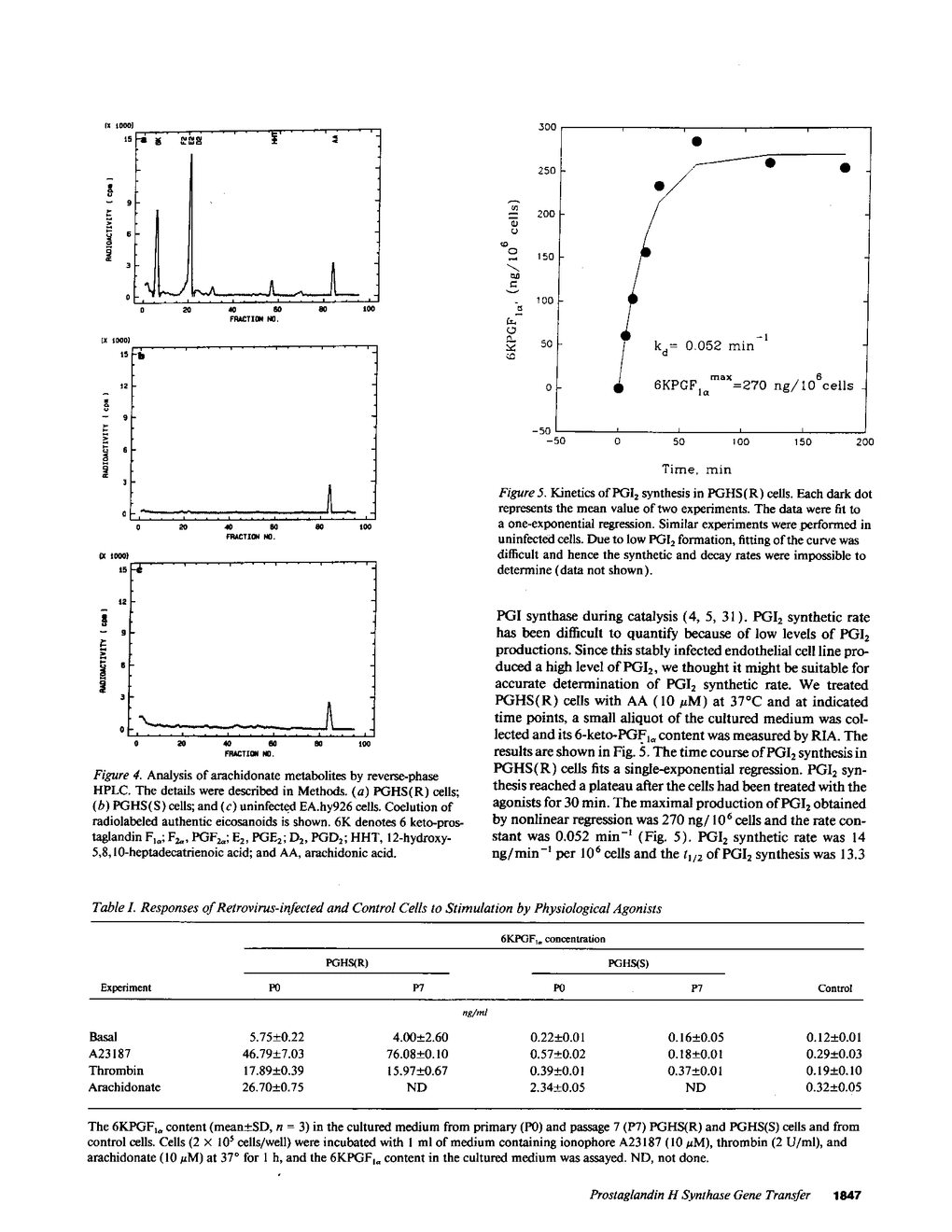 A retroviral vector (BAG) was used to transfer human prostaglandin H synthase (PGHS-1) gene into a human endothelial cell line for enhancement of PGI2 synthesis. Cells infected with BAG containing PGHS-1 cDNA in the sense orientation relative to the retroviral promoter (PGHS(S)) expressed a 30-fold increase in mRNA but, due to a reading frame shift, did not show an increase in PGHS protein or in PGI2 synthesis, while those with PGHS-1 in reverse orientation relative to the viral promoter (PGHS(R)), produced a > 10-fold increase in PGHS mRNA over the control (169 +/- 22 vs 14.8 +/- 1.2 amol/micrograms RNA) with a concordant increase in PGHS protein (5.82 +/- 1.07 vs 0.23 +/- 0.04 ng/mg protein) and enzyme activity. Primer extension analysis of PGHS(R) revealed two transcription start sites located in the SV40 late promoter region adjacent to PGHS-1 cDNA. PGHS(R) cells produced a high basal PGI2 level which was increased by several-fold in response to stimulation by ionophore, arachidonic acid, and thrombin. Kinetic analysis revealed the PGI2 synthetic rate to be 14 ng/min-1 per million cells and t1/2 of PGI2 synthesis, 13.3 min. These findings indicate that transfer of PGHS-1 gene into vascular cells enhances PGI2 synthesis and may be a useful strategy for restoring thromboprotective property of damaged blood vessels.