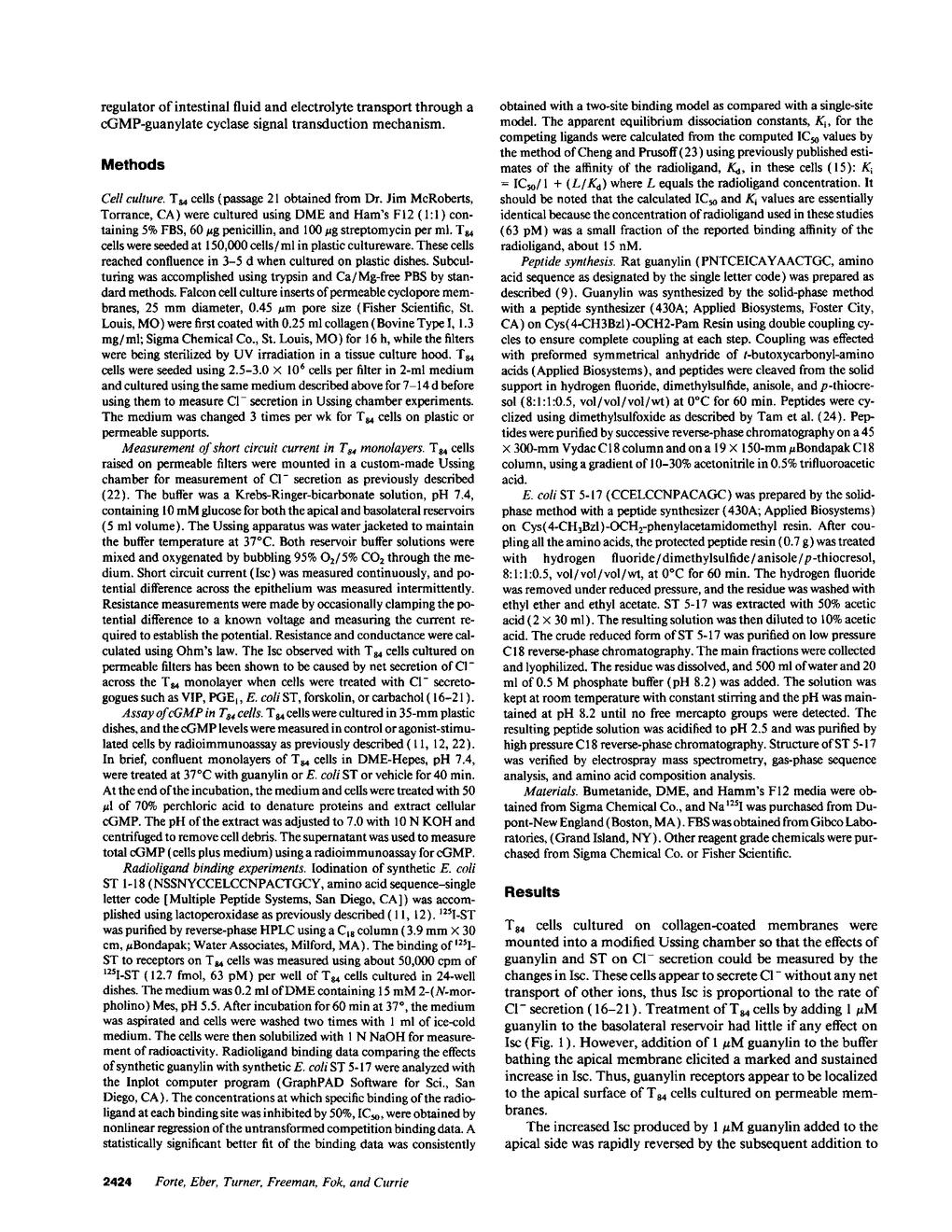 Intestinal salt and fluid secretion is stimulated by Escherichia coli heat-stable enterotoxins (ST) through activation of a membrane guanylate cyclase found in the intestine. Guanylin is an endogenous intestinal peptide that has structural similarity to the bacterial peptides. Synthetic preparations of guanylin or E. coli ST 5-17 stimulated Cl- secretion in T84 cells cultured on semipermeable membranes as measured by increases in short circuit current (Isc). The guanylin/ST receptors appeared to be on the apical surface of T84 cells, since addition of guanylin to the apical, but not basolateral, reservoir stimulated Isc. Bumetanide added to the basolateral side effectively inhibited the Isc responses of T84 cells to either guanylin or ST 5-17. Guanylin appeared to be about one-tenth as potent as ST in stimulating transepithelial Cl- secretion. Guanylin and E. coli ST 5-17 both caused massive (> 1,000-fold) increases in cGMP levels in T84 cells, but guanylin was less potent than ST. Both peptides fully inhibited the binding of 125I-ST to receptor sites on intact T84 cells. The radioligand binding data obtained with guanylin or ST 5-17 best fit a model predicting two receptors with different affinity for these ligands. The Ki values for guanylin were 19 +/- 5 nM and 1.3 +/- 0.5 microM, whereas the Ki values for ST 5-17 were 78 +/- 38 pM and 4.9 +/- 1.4 nM. We conclude that guanylin stimulated Cl- secretion via the second messenger, cGMP, in T84 human colon cells. At least two guanylin receptors with different affinities for these ligands may exist in the cultured T84 cells. It may be postulated that guanylin is an endogenous hormone that controls intestinal Cl- secretion by a paracrine mechanism via cGMP and that E. coli ST stimulates Cl- secretion by virtue of an opportunistic mechanism through activation of guanylin receptors.
