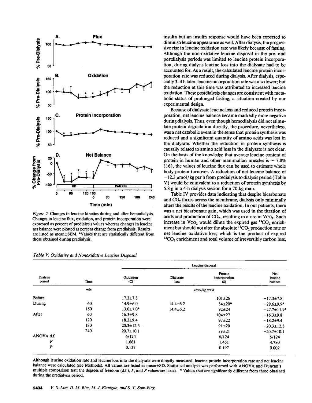 To assess the effect of hemodialysis on protein metabolism, leucine flux was measured in seven patients before, during, and after high efficiency hemodialysis using cuprophane dialyzers and bicarbonate dialysate during a primed-constant infusion of L-[1-13C]leucine. The kinetics [mumol/kg per h, mean +/- SD] are as follows: leucine appearance into the plasma leucine pool was 86 +/- 28, 80 +/- 28, and 85 +/- 25, respectively, before, during, and after dialysis. Leucine appearance into the whole body leucine pool, derived from plasma [1-13C]alpha-ketoisocaproate enrichment, was 118 +/- 31, 118 +/- 31, and 114 +/- 28 before, during, and after dialysis, respectively. In the absence of leucine intake, appearance rate reflects protein degradation, which was clearly unaffected by dialysis. Leucine oxidation rate was 17.3 +/- 7.8 before, decreased to 13.8 +/- 7.8 during, and increased to 18.9 +/- 10.3 after dialysis (P = 0.027). Leucine protein incorporation was 101 +/- 26 before, was reduced to 89 +/- 23 during, and returned to 95 +/- 23 after dialysis (P = 0.13). Leucine net balance, the difference between leucine protein incorporation and leucine release from endogenous degradation, was -17.3 +/- 7.8 before, decreased to -28.5 +/- 11.0 during, and returned to -18.9 +/- 10.3 after dialysis (P < 0.0001). This markedly more negative leucine balance during dialysis was accountable by dialysate leucine loss, which was 14.4 +/- 6.2 mumol/kg per h. These data suggest that hemodialysis using a cuprophane membrane did not acutely induce protein degradation. It was, nevertheless, a net catabolic event because protein synthesis was reduced and amino acid was lost into the dialysate.
