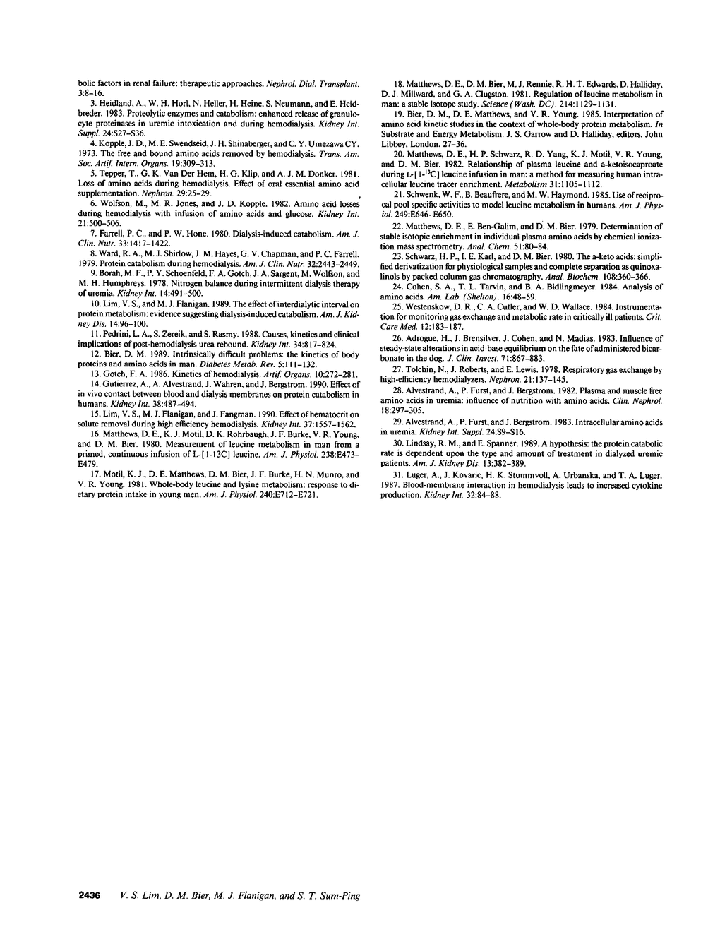 To assess the effect of hemodialysis on protein metabolism, leucine flux was measured in seven patients before, during, and after high efficiency hemodialysis using cuprophane dialyzers and bicarbonate dialysate during a primed-constant infusion of L-[1-13C]leucine. The kinetics [mumol/kg per h, mean +/- SD] are as follows: leucine appearance into the plasma leucine pool was 86 +/- 28, 80 +/- 28, and 85 +/- 25, respectively, before, during, and after dialysis. Leucine appearance into the whole body leucine pool, derived from plasma [1-13C]alpha-ketoisocaproate enrichment, was 118 +/- 31, 118 +/- 31, and 114 +/- 28 before, during, and after dialysis, respectively. In the absence of leucine intake, appearance rate reflects protein degradation, which was clearly unaffected by dialysis. Leucine oxidation rate was 17.3 +/- 7.8 before, decreased to 13.8 +/- 7.8 during, and increased to 18.9 +/- 10.3 after dialysis (P = 0.027). Leucine protein incorporation was 101 +/- 26 before, was reduced to 89 +/- 23 during, and returned to 95 +/- 23 after dialysis (P = 0.13). Leucine net balance, the difference between leucine protein incorporation and leucine release from endogenous degradation, was -17.3 +/- 7.8 before, decreased to -28.5 +/- 11.0 during, and returned to -18.9 +/- 10.3 after dialysis (P < 0.0001). This markedly more negative leucine balance during dialysis was accountable by dialysate leucine loss, which was 14.4 +/- 6.2 mumol/kg per h. These data suggest that hemodialysis using a cuprophane membrane did not acutely induce protein degradation. It was, nevertheless, a net catabolic event because protein synthesis was reduced and amino acid was lost into the dialysate.