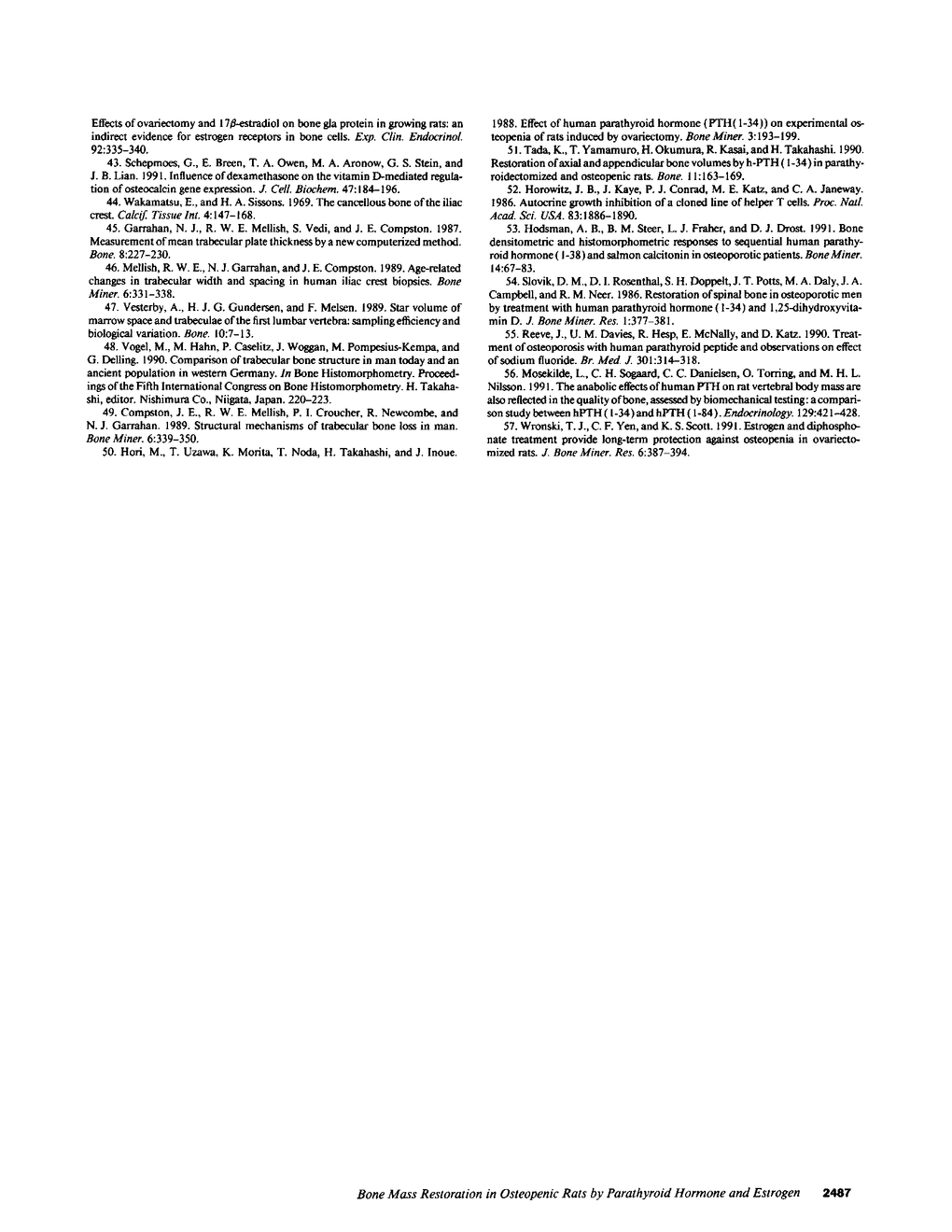 To evaluate the potential use of a combination of antiresorption and bone formation-promoting agents as a treatment for postmenopausal osteoporosis, we examined the effects of combined and separate administration of estrogen (17 beta-estradiol, 30 micrograms/kg per d, s.c.) and parathyroid hormone (rPTH [1-34], 40 micrograms/kg per d, s.c.) on the proximal tibia of ovariectomized (Ovx) rats. The treatments lasted for 4 wk and were initiated 1, 3, and 5 wk after surgery. Ovx resulted in rapid loss of cancellous bone volume (Cn-BV/TV) as well as trabecular connectivity, as determined by two dimensional strut analysis. When administered in a preventive mode, treatment beginning 1 wk post-Ovx, estrogen or PTH treatment alone preserved Cn-BV/TV and trabecular connectivity, and combined estrogen and PTH treatment caused a 40% increment in Cn-BV/TV while maintaining comparable trabecular connectivity with that seen in the Sham-operated animals. When administered in a curative mode to rats with established osteoporosis, treatments beginning 3 or 5 wk post-Ovx, estrogen or PTH treatment alone prevented further loss of connectivity and Cn-BV/TV, whereas the combined treatment resulted in as much as a 300% improvement in one of the parameters of trabecular connectivity, node to node strut length, and a 106% increase in Cn-BV/TV, with respect to the bone status at the initiation of treatment. The beneficial effects of this combined treatment derive from estrogen's ability to prevent accelerated bone resorption and, simultaneously, PTH's promotion of bone formation. These data demonstrate, in an animal model, that therapies can be devised to cure the skeletal defects associated with established osteoporosis.