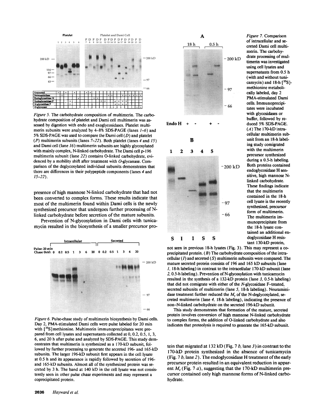 In this report, we describe the intracellular localization of multimerin in platelets and its biosynthesis by Dami cells, a megakaryocytic cell line. Immunoelectron microscopy was used to examine frozen thin sections of resting and activated platelets. Multimerin was localized within the platelet alpha-granule in an eccentric position. Within activated platelets, multimerin was found in the surface-connected open cannalicular system and on the external plasma membrane. Light microscopic immunocytochemistry demonstrated multimerin in normal megakaryocytes and in Dami cells after stimulation with PMA. Confirmation of multimerin biosynthesis by Dami cells was obtained by metabolic labeling studies. Both platelet and Dami cell multimerin demonstrated several subunit sizes on reduced SDS-PAGE. However, peptide mapping confirmed structural homology between the different multimerin subunits. Glycosidase digestion demonstrated that multimerin is heavily glycosylated with mainly complex, N-linked carbohydrate. In contrast to the multimerin isolated from platelets, cultured Dami cells secreted mainly smaller multimers of the protein. Biosynthesis of multimerin by a megakaryocytic cell line supports endogenous biosynthesis by megakaryocytes as the origin of this platelet alpha-granule protein.