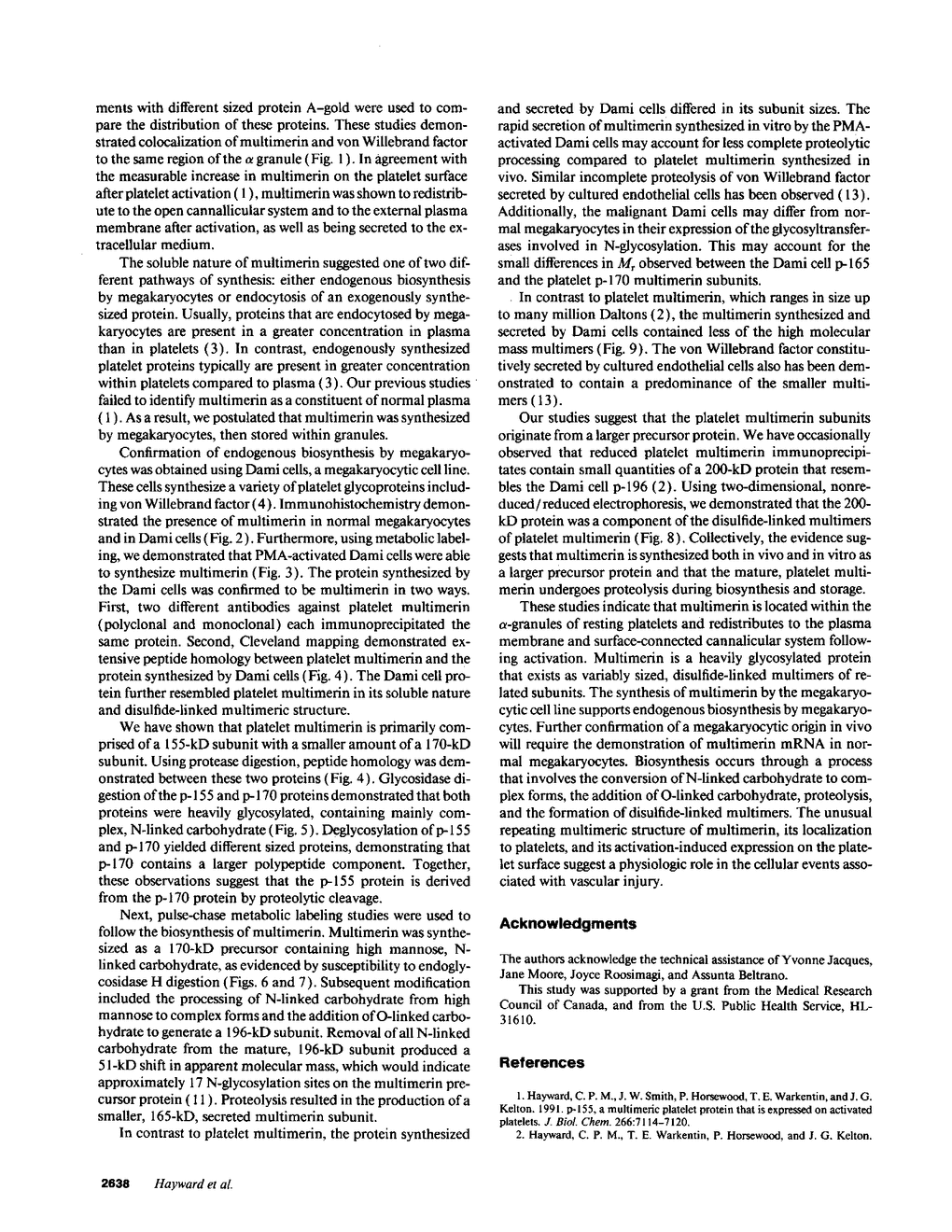 In this report, we describe the intracellular localization of multimerin in platelets and its biosynthesis by Dami cells, a megakaryocytic cell line. Immunoelectron microscopy was used to examine frozen thin sections of resting and activated platelets. Multimerin was localized within the platelet alpha-granule in an eccentric position. Within activated platelets, multimerin was found in the surface-connected open cannalicular system and on the external plasma membrane. Light microscopic immunocytochemistry demonstrated multimerin in normal megakaryocytes and in Dami cells after stimulation with PMA. Confirmation of multimerin biosynthesis by Dami cells was obtained by metabolic labeling studies. Both platelet and Dami cell multimerin demonstrated several subunit sizes on reduced SDS-PAGE. However, peptide mapping confirmed structural homology between the different multimerin subunits. Glycosidase digestion demonstrated that multimerin is heavily glycosylated with mainly complex, N-linked carbohydrate. In contrast to the multimerin isolated from platelets, cultured Dami cells secreted mainly smaller multimers of the protein. Biosynthesis of multimerin by a megakaryocytic cell line supports endogenous biosynthesis by megakaryocytes as the origin of this platelet alpha-granule protein.