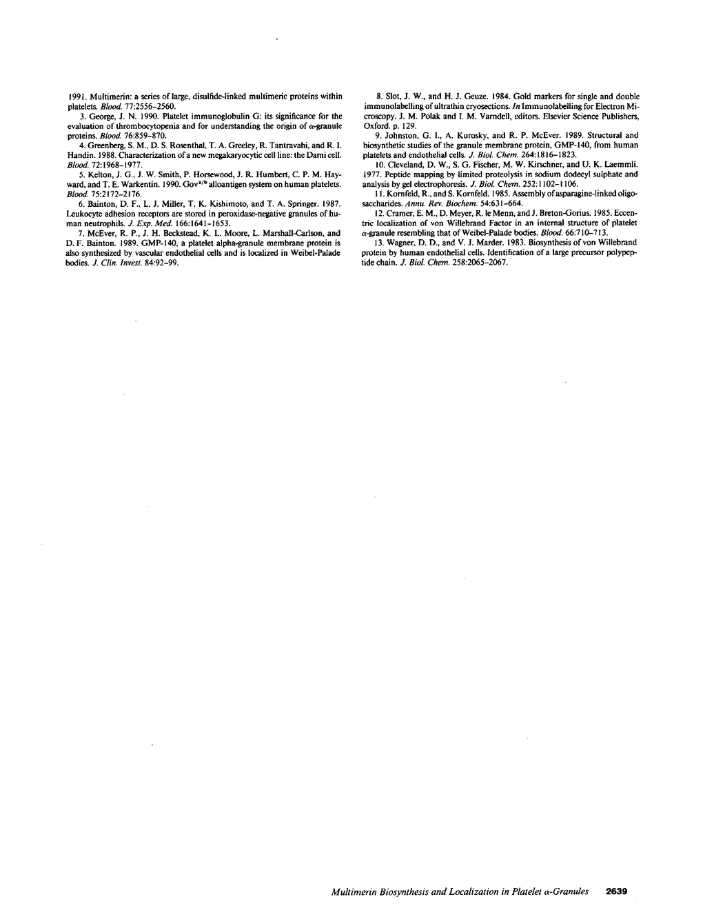 In this report, we describe the intracellular localization of multimerin in platelets and its biosynthesis by Dami cells, a megakaryocytic cell line. Immunoelectron microscopy was used to examine frozen thin sections of resting and activated platelets. Multimerin was localized within the platelet alpha-granule in an eccentric position. Within activated platelets, multimerin was found in the surface-connected open cannalicular system and on the external plasma membrane. Light microscopic immunocytochemistry demonstrated multimerin in normal megakaryocytes and in Dami cells after stimulation with PMA. Confirmation of multimerin biosynthesis by Dami cells was obtained by metabolic labeling studies. Both platelet and Dami cell multimerin demonstrated several subunit sizes on reduced SDS-PAGE. However, peptide mapping confirmed structural homology between the different multimerin subunits. Glycosidase digestion demonstrated that multimerin is heavily glycosylated with mainly complex, N-linked carbohydrate. In contrast to the multimerin isolated from platelets, cultured Dami cells secreted mainly smaller multimers of the protein. Biosynthesis of multimerin by a megakaryocytic cell line supports endogenous biosynthesis by megakaryocytes as the origin of this platelet alpha-granule protein.
