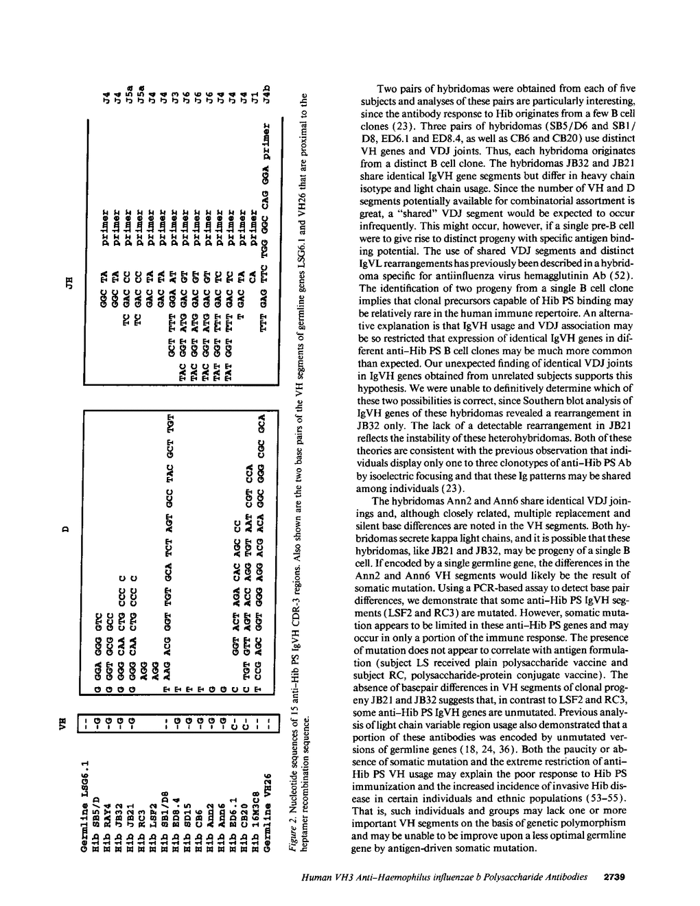 To examine the human antibody repertoire generated against a biologically significant antigen we have obtained sequences of heavy chain variable region genes (IgVH) from 15 monoclonal antibodies specific for the capsular polysaccharide of Haemophilus influenzae type b (Hib PS). All VH segments are members of the VH3 family and 9 of 15 are members of the smaller VH3b subfamily. Restriction is evident by the shared use of certain VDJ joints in independent hybridomas from different subjects. Two hybridomas generated from the same subject demonstrate identical heavy chain variable region gene sequences but differ in isotype and rearrange alternative light chain variable region genes (IgVL), suggesting that in a normal immune response, a single pre-B cell clone may use different light chain rearrangements and give rise to progeny capable of reacting with antigen. Using a polymerase chain reaction assay optimized to detect base pair differences among VH genes we demonstrate that at least a portion of expressed anti-Hib PS VH genes have undergone somatic mutation. Anti-Hib PS heavy chain genes are homologous to VH segments encoding autoantibodies and two hybridomas secrete anti-Hib PS antibody that cross-reacts with self antigens (double-stranded DNA and single-stranded DNA). Comparison of VH regions of self-reactive and monospecific anti-Hib PS Ab demonstrates no consistent structural feature correlating with fine antigen specificity. These data demonstrate significant restriction in VH usage and VDJ recombination in the anti-Hib PS response and confirm that autoantibodies may be elicited during normal immune responses.