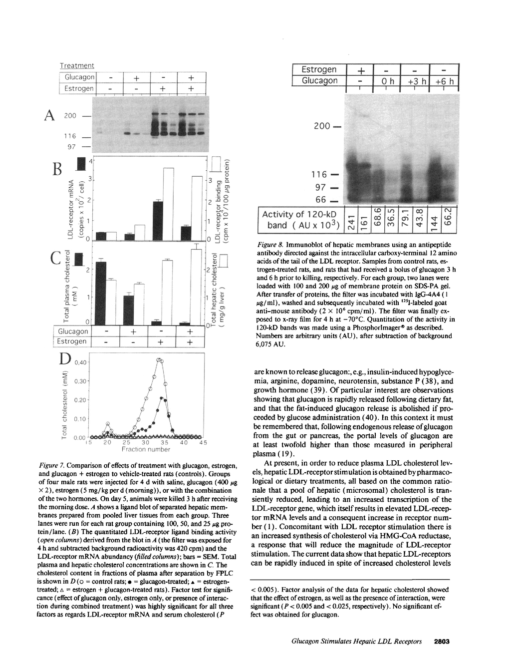 We studied the influence of glucagon on hepatic LDL receptors and plasma lipoproteins in rats. A dose-dependent (maximum, threefold) increase in LDL-receptor binding was evident already at a dose of 2 x 4 micrograms, and detectable 3 h after injection; concomitantly, cholesterol and apolipoprotein (apo) B and apoE within LDL and large HDL decreased in plasma. LDL receptor mRNA levels were however unaltered or reduced. Hepatic microsomal cholesterol was increased and the enzymatic activities of 3-hydroxy-3-methylglutaryl coenzyme A reductase and cholesterol 7 alpha-hydroxylase in hepatic microsomes were reduced. Insulin alone increased receptor binding and receptor mRNA levels twofold, but plasma cholesterol was unchanged and plasma apoE and apoB increased. Administration of insulin to glucagon-treated animals reduced the LDL-receptor binding to control levels and apoB appeared in LDL particles. Estrogen treatment increased LDL-receptor binding and mRNA levels five- and eightfold, respectively. Combined treatment with glucagon and estrogen reduced the stimulation of LDL-receptor mRNA levels by 80% although LDL-receptor binding was unchanged. Immunoblot analysis showed that glucagon increased the number of hepatic LDL receptors. We conclude that glucagon induces the number of hepatic LDL receptors by a mechanism not related to increased mRNA levels, suggesting the presence of a posttranscriptional regulatory mechanism present in the liver in vivo.