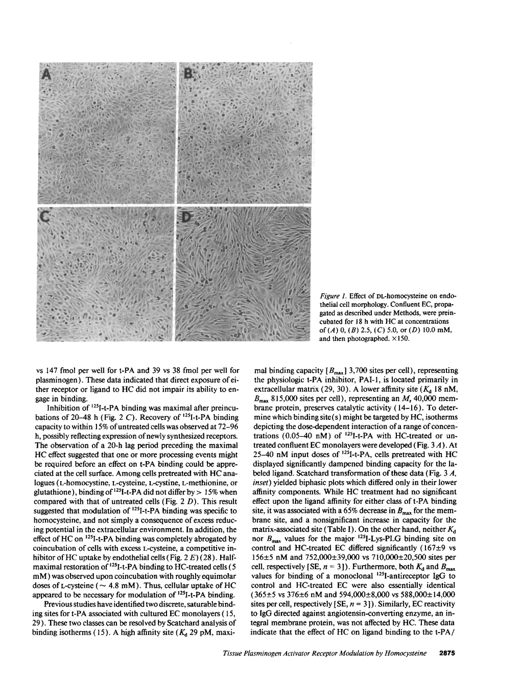 Endothelial cells impart thromboresistance to the blood vessel wall. As modulators of fibrinolytic activity, these cells synthesize and secrete tissue plasminogen activator (t-PA) as well as its physiologic inhibitor, plasminogen activator inhibitor-1. In addition, endothelial cells support membrane-associated assembly of plasminogen and tissue plasminogen activator. Recently, an M(r) approximately 40,000 protein expressed on endothelial cells has been shown to interact noncompetitively through disparate mechanisms with both t-PA and plasminogen, suggesting trimolecular assembly of enzyme, substrate, and receptor (Hajjar, K. A. 1991. J. Biol. Chem. 266:21962-21970). In the present study, treatment of cultured endothelial cells with DL-homocysteine was specifically associated with a selective reduction in cellular binding sites for t-PA. This 65% decrease in binding was associated with a 60% decrease in cell-associated t-PA activity. No change in affinity for t-PA or plasminogen or in the maximal number of binding sites for plasminogen was observed. Matrix-associated t-PA binding sites were not affected. These data suggest a new mechanism whereby homocysteine may perturb endothelial cell function, thus promoting a prothrombotic state at the surface of the blood vessel wall.