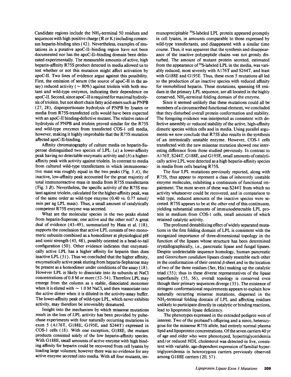A proband with chylomicronemia, pancreatitis, and non-insulin-dependent diabetes (NIDDM) bears two different mutations in exon 3 of the lipoprotein lipase (LPL) gene: a missense mutation, 75Arg-->Ser, inherited through the paternal line and a truncation, 73Tyr-->Ter, through the maternal line. NIDDM appeared to be independently segregating. The R75S mutant was studied in extracts and media from transfected COS-1 cells. Detectable amounts of catalytically competent R75S LPL suggested destabilization of the active homodimer as with exon 5 mutants (Hata et al. 1992. J. Biol. Chem. 267:20132-20139). Hydrolysis of a short-chain fatty acid ester indicated that R75S does not directly affect activation of LPL by apoC-II. Subjects with NIDDM and wild-type LPL, and nondiabetic middle-aged carriers of the 73Tyr-->Ter truncation had moderate hypertriglyceridemia (260-521 mg/dl) and reduced high density lipoprotein cholesterol. A maternal aunt with NIDDM carried the truncation. Her phenotype (triglycerides of 5,300 mg/dl, eruptive xanthomatosis, and recurrent pancreatitis) was as severe as that in homozygotes or compound heterozygotes. We conclude: (a) diabetic carriers of dysfunctional LPL alleles are at risk for severe lipemia; and (b) the physiologic defects in NIDDM may be additive or synergistic with heterozygous LPL deficiency.