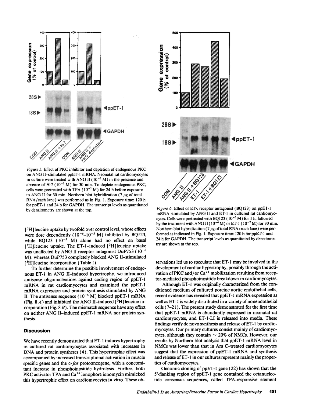To elucidate the cellular mechanism by which angiotensin II (ANG II) induces cardiac hypertrophy, we investigated the possible autocrine/paracrine role of endogenous endothelin-1 (ET-1) in ANG II-induced hypertrophy of neonatal rat cardiomyocytes by use of synthetic ET-1 receptor antagonist and antisense oligonucleotides to preproET-1 (ppET-1) mRNA. Northern blot analysis and in situ hybridization revealed that ppET-1 mRNA was expressed in cardiomyocytes, but, to a lesser extent, in nonmyocytes as well. ANG II upregulated ppET-1 mRNA level by threefold over control level as early as 30 min, and it stimulated release of immunoreactive ET-1 from cardiomyocytes in a dose- and time-dependent manner. ET-1 stimulated ppET-1 mRNA levels after 30 min in a similar fashion as ANG II. Tetradecanoylphorbol-acetate (10(-7) M) mimicked the effects of ANG II and ET-1 on induction of ppET-1 mRNA. ANG II-induced ppET-1 gene expression was completely blocked by protein kinase C inhibitor H-7 or by down-regulation of endogenous protein kinase C by pretreatment with phorbol ester. ET-1 and ANG II stimulated twofold increase [3H]leucine incorporation into cardiomyocytes, whose effects were similarly and dose dependently inhibited by endothelin A receptor antagonist (BQ123). Introduction of antisense sequence against coding region of ppET-1 mRNA into cardiomyocytes resulted in complete blockade with ppET-1 mRNA levels and [3H]leucine incorporation stimulated by ANG II. These results suggest that endogenous ET-1 locally generated and secreted by cardiomyocytes may contribute to ANG II-induced cardiac hypertrophy via an autocrine/paracrine fashion.