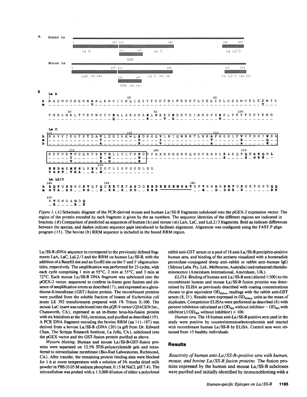 Human anti-La/SS-B autoantibodies are known to react with highly conserved epitopes suggested to be functional or active sites on the La/SS-B polypeptide. This study was designed to determine whether the autoantibodies also react with poorly conserved regions of La/SS-B as predicted by an antigen-driven autoimmune response. Binding of human autoantibodies to purified human, mouse, and bovine recombinant fragments representing immunodominant regions of the La/SS-B polypeptide was compared using Western blotting and ELISA. A cross-reactive epitope was located in the highly conserved NH2-terminal region of La/SS-B. Significantly, human-specific epitopes were identified in both the conserved RNA-recognition motif and a poorly conserved COOH-terminal fragment, providing direct evidence for an autoantigen-driven response. The lack of autoantibody cross-reactivity with a conserved domain of mouse and bovine La/SS-B implies that a small number of residues in human autoepitopes may be critical for autoimmunogenicity.