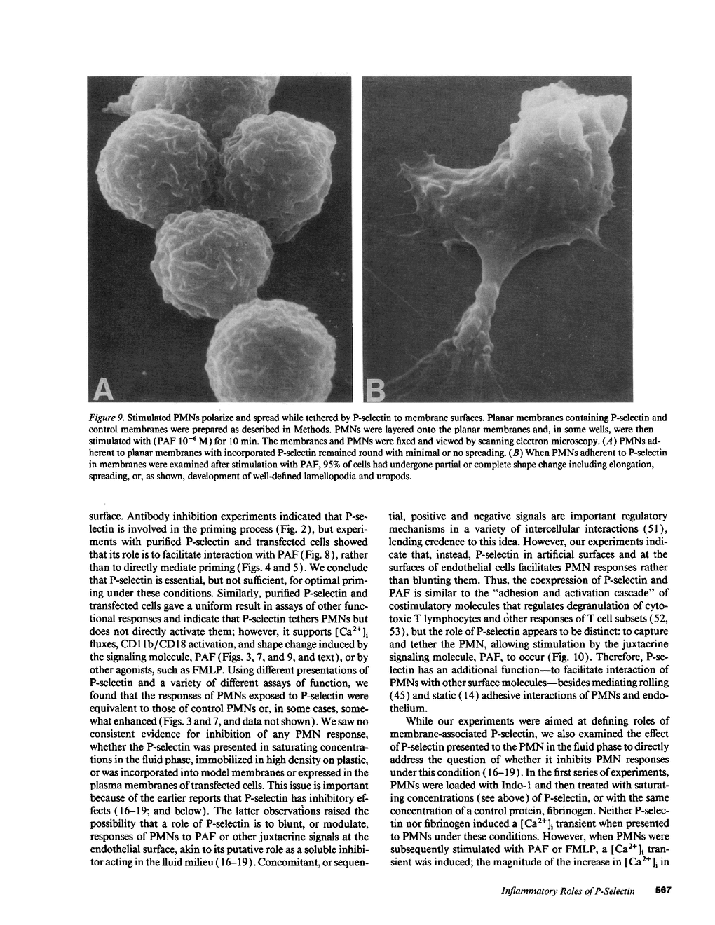 Polymorphonuclear leukocytes (PMNs) bind rapidly and reversibly to endothelial cells induced to express P-selectin, a glycoprotein that mediates adhesive intercellular interactions. In addition, PMNs adherent to endothelium expressing P-selectin demonstrate an intracellular Ca2+ transient, functionally up-regulate beta-2-integrins (CD11/CD18 glycoproteins), become polarized in shape, and are primed for enhanced degranulation when subsequently stimulated with chemotactic factors. However, P-selectin induces none of these responses directly when used alone, when incorporated into model membranes, or when expressed by transfected cells. The absence of direct activation of the PMNs is not due to competing antiinflammatory effects of P-selectin; instead, purified P-selectin and P-selectin in membranes support agonist-stimulated PMN responses. Furthermore, tethering of PMNs to endothelial surfaces by P-selectin is required for priming to occur efficiently, as shown by experiments with blocking monoclonal antibodies. The priming event is directly mediated by the signaling molecule, platelet-activating factor (PAF), and is inhibited by blocking the PAF receptor on PMNs. Thus, P-selectin and PAF are components of an adhesion and activation cascade, but have distinct roles: P-selectin tethers and captures the PMN, whereas PAF mediates juxtacrine activation. In vivo, selectins may facilitate interaction of target cells with membrane-bound molecules that send intercellular signals, in addition to mediating rolling of leukocytes and other adhesive functions.