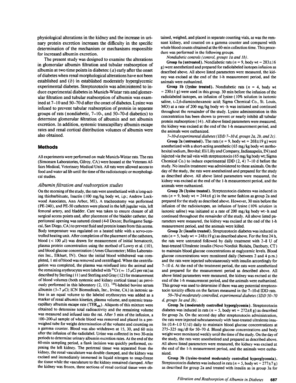 Microalbuminuria (26-250 mg/d) is considered to be an indicator of incipient diabetic nephropathy in humans in insulin-dependent diabetes (IDD). However, before microalbuminuria is observed, glomerular alterations, such as glycosylation of the glomerular basement membrane and glomerular hyperfiltration, in IDD may result in increased filtration of albumin before any observed increase in albumin excretion. Glomerular and tubular albumin kinetics were examined in streptozotocin (65 mg/kg body wt, i.v.) diabetic, Munich-Wistar rats at 7-10 (untreated) and 50-70 d (poorly controlled with small doses of insulin) after the onset of diabetes and compared with nondiabetic controls. Additional rats in each condition received acute lysine treatment to prevent tubular protein reabsorption. Urinary albumin excretion and nonvascular albumin distribution volumes were measured in the renal cortex and compared with morphometric measurements of interstitial space and the proximal tubule to assess intracellular uptake of albumin in the proximal tubule. Urinary albumin excretion under anesthesia was not different in 7-10-d IDD versus controls (19 +/- 3 vs. 20 +/- 3 micrograms/min) but increased in the 50-70-d IDD (118 +/- 13 micrograms/min, P < 0.05). Lysine treatment resulted in increased albumin excretion compared with respective nontreatment in 7-10-d IDD (67 +/- 10 micrograms/min, P < 0.05) but not in controls (30 +/- 6 micrograms/min) or in 50-70-d IDD (126 +/- 11 micrograms/min). Glomerular filtration rate was increased both in 7-10-d IDD (2.7 +/- 0.1 ml/min, P < 0.05) and in 50-70-d IDD (2.6 +/- 0.1 ml/min, P < 0.05) compared with control (2.2 +/- 0.1 ml/min). Calculated urinary space albumin concentrations increased early in IDD with 2.5 +/- 0.4 mg% in 7-10-d IDD and 4.9 +/- 0.6 mg% in 50-70-d IDD compared with control (1.4 +/- 0.3 mg%). The increase in filtration of albumin is in excess of that attributable to hyperfiltration before increased albumin excretion early in diabetes. In 50-70-d IDD, absolute tubular reabsorption of albumin is decreased, correlating to the decrease in brush border height of the proximal tubule.
