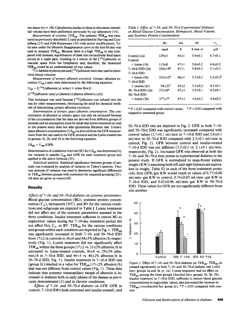 Microalbuminuria (26-250 mg/d) is considered to be an indicator of incipient diabetic nephropathy in humans in insulin-dependent diabetes (IDD). However, before microalbuminuria is observed, glomerular alterations, such as glycosylation of the glomerular basement membrane and glomerular hyperfiltration, in IDD may result in increased filtration of albumin before any observed increase in albumin excretion. Glomerular and tubular albumin kinetics were examined in streptozotocin (65 mg/kg body wt, i.v.) diabetic, Munich-Wistar rats at 7-10 (untreated) and 50-70 d (poorly controlled with small doses of insulin) after the onset of diabetes and compared with nondiabetic controls. Additional rats in each condition received acute lysine treatment to prevent tubular protein reabsorption. Urinary albumin excretion and nonvascular albumin distribution volumes were measured in the renal cortex and compared with morphometric measurements of interstitial space and the proximal tubule to assess intracellular uptake of albumin in the proximal tubule. Urinary albumin excretion under anesthesia was not different in 7-10-d IDD versus controls (19 +/- 3 vs. 20 +/- 3 micrograms/min) but increased in the 50-70-d IDD (118 +/- 13 micrograms/min, P < 0.05). Lysine treatment resulted in increased albumin excretion compared with respective nontreatment in 7-10-d IDD (67 +/- 10 micrograms/min, P < 0.05) but not in controls (30 +/- 6 micrograms/min) or in 50-70-d IDD (126 +/- 11 micrograms/min). Glomerular filtration rate was increased both in 7-10-d IDD (2.7 +/- 0.1 ml/min, P < 0.05) and in 50-70-d IDD (2.6 +/- 0.1 ml/min, P < 0.05) compared with control (2.2 +/- 0.1 ml/min). Calculated urinary space albumin concentrations increased early in IDD with 2.5 +/- 0.4 mg% in 7-10-d IDD and 4.9 +/- 0.6 mg% in 50-70-d IDD compared with control (1.4 +/- 0.3 mg%). The increase in filtration of albumin is in excess of that attributable to hyperfiltration before increased albumin excretion early in diabetes. In 50-70-d IDD, absolute tubular reabsorption of albumin is decreased, correlating to the decrease in brush border height of the proximal tubule.