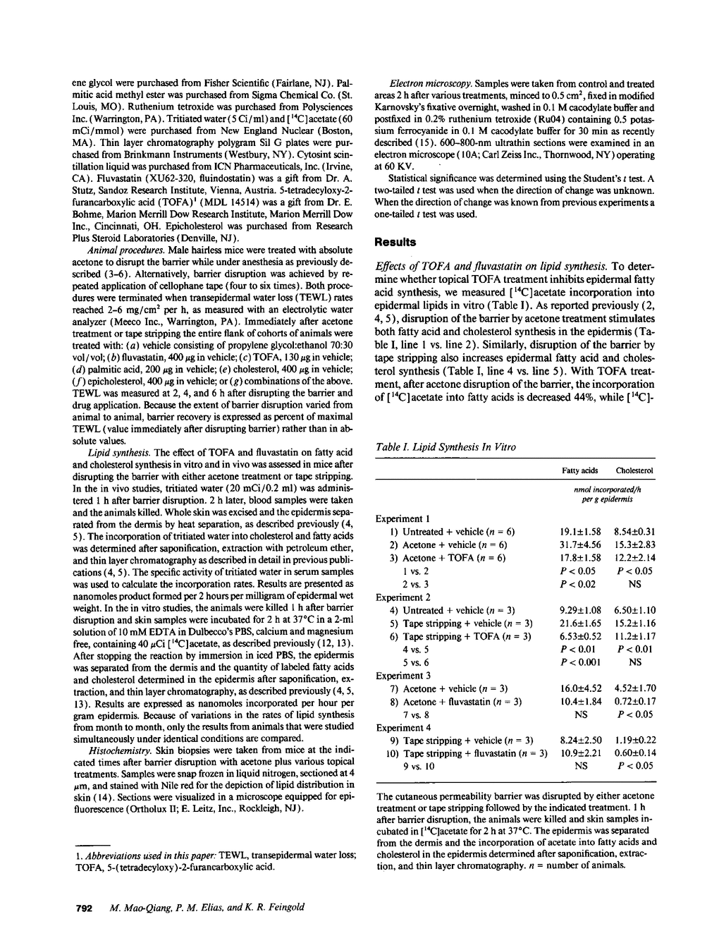 The permeability barrier is mediated by a mixture of ceramides, sterols, and free fatty acids arranged as extracellular lamellar bilayers in the stratum corneum. Whereas prior studies have shown that cholesterol and ceramides are required for normal barrier function, definitive evidence for the importance of nonessential fatty acids is not available. To determine whether epidermal fatty acid synthesis also is required for barrier homeostasis, we applied 5-(tetradecyloxy)-2-furancarboxylic acid (TOFA), an inhibitor of acetyl CoA carboxylase, after disruption of the barrier by acetone or tape stripping. TOFA inhibits epidermal fatty acid by approximately 50% and significantly delays barrier recovery. Moreover, coadministration of palmitate with TOFA normalizes barrier recovery, indicating that the delay is due to a deficiency in bulk fatty acids. Furthermore, TOFA treatment also delays the return of lipids to the stratum corneum and results in abnormalities in the structure of lamellar bodies, the organelle which delivers lipid to the stratum corneum. In addition, the organization of secreted lamellar body material into lamellar bilayers within the stratum corneum interstices is disrupted by TOFA treatment. Finally, these abnormalities in lamellar body and stratum corneum membrane structure are corrected by coapplication of palmitate with TOFA. These results demonstrate a requirement for bulk fatty acids in barrier homeostasis. Thus, inhibiting the epidermal synthesis of any of the three key lipids that form the extracellular, lipid-enriched membranes of the stratum corneum results in an impairment in barrier homeostasis.
