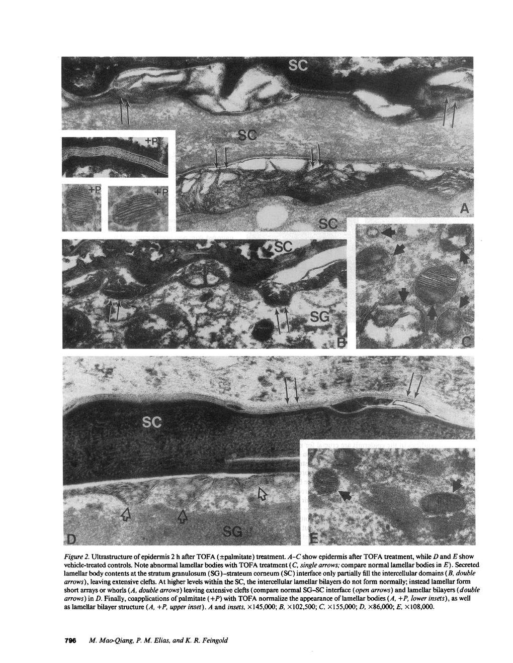 The permeability barrier is mediated by a mixture of ceramides, sterols, and free fatty acids arranged as extracellular lamellar bilayers in the stratum corneum. Whereas prior studies have shown that cholesterol and ceramides are required for normal barrier function, definitive evidence for the importance of nonessential fatty acids is not available. To determine whether epidermal fatty acid synthesis also is required for barrier homeostasis, we applied 5-(tetradecyloxy)-2-furancarboxylic acid (TOFA), an inhibitor of acetyl CoA carboxylase, after disruption of the barrier by acetone or tape stripping. TOFA inhibits epidermal fatty acid by approximately 50% and significantly delays barrier recovery. Moreover, coadministration of palmitate with TOFA normalizes barrier recovery, indicating that the delay is due to a deficiency in bulk fatty acids. Furthermore, TOFA treatment also delays the return of lipids to the stratum corneum and results in abnormalities in the structure of lamellar bodies, the organelle which delivers lipid to the stratum corneum. In addition, the organization of secreted lamellar body material into lamellar bilayers within the stratum corneum interstices is disrupted by TOFA treatment. Finally, these abnormalities in lamellar body and stratum corneum membrane structure are corrected by coapplication of palmitate with TOFA. These results demonstrate a requirement for bulk fatty acids in barrier homeostasis. Thus, inhibiting the epidermal synthesis of any of the three key lipids that form the extracellular, lipid-enriched membranes of the stratum corneum results in an impairment in barrier homeostasis.